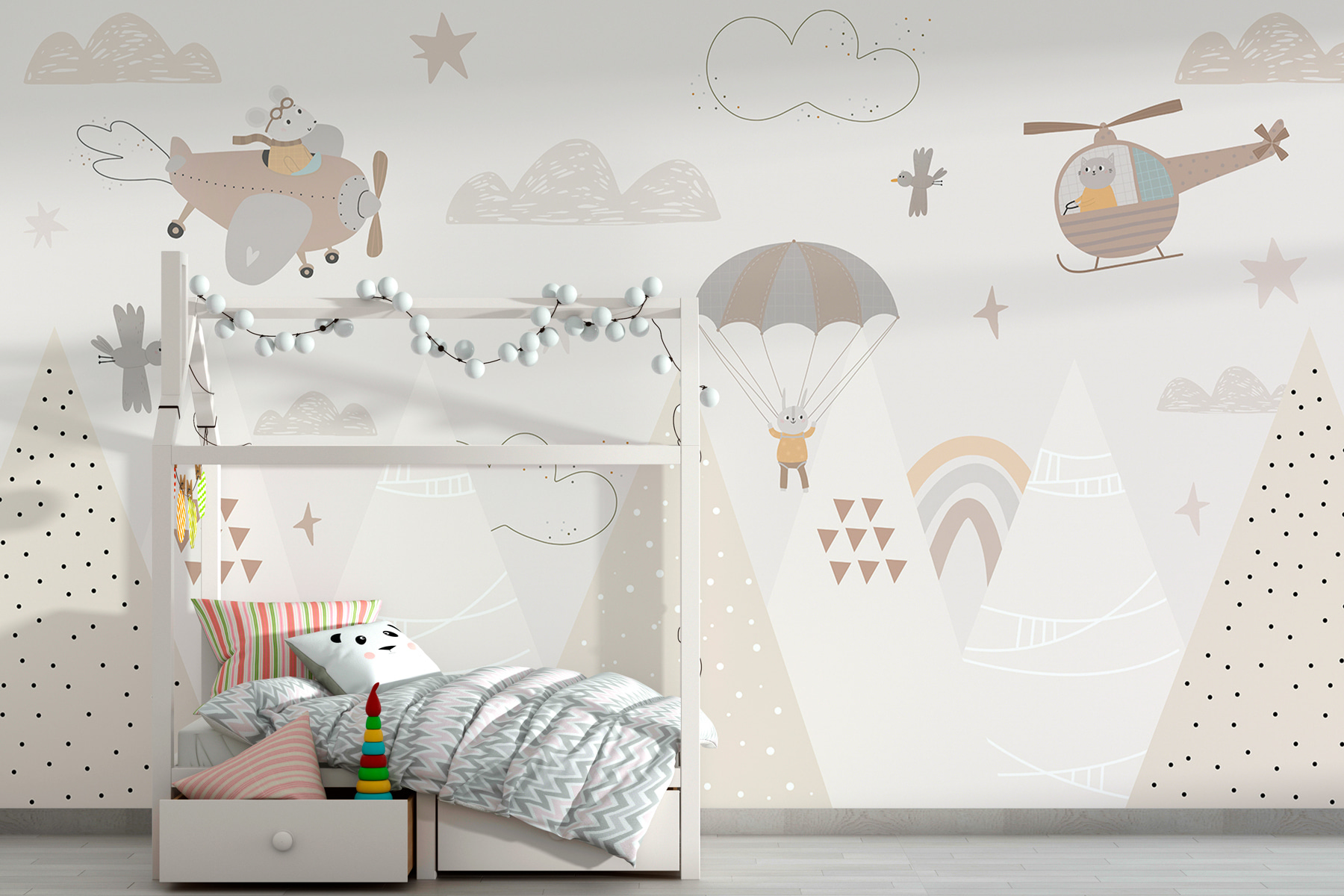 Los sutiles colores pastel y los divertidos detalles añaden magia allá donde mires: nubes, estrellas e incluso un conejito que salta en paracaídas. Casi puedes oír el suave silbido del viento y el alegre piar de los pájaros. Es perfecto para despertar la imaginación de los más pequeños y convertir los cuentos de antes de dormir en grandes historias de aventuras aéreas.