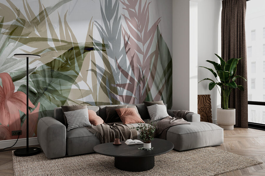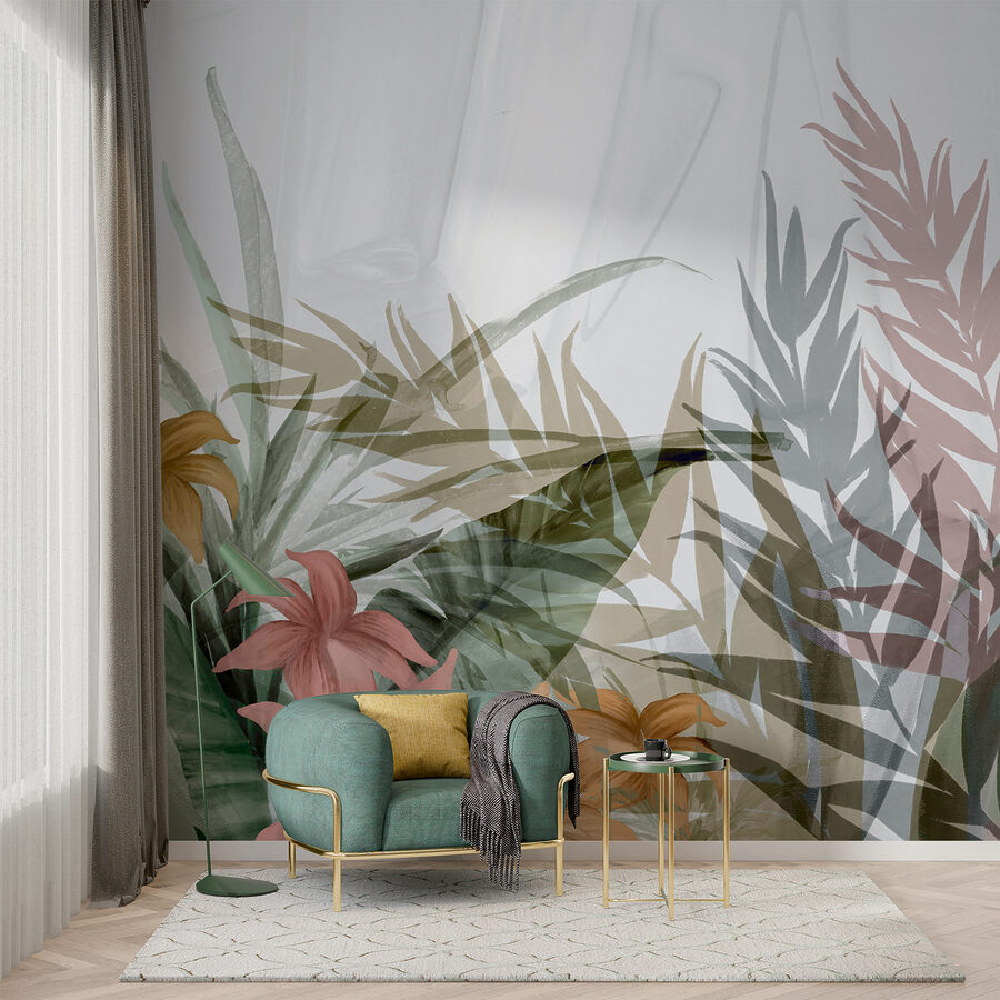 Imagínese esto: un mural que transforma su pared en un oasis de serenidad. Presentamos nuestro diseño floral abstracto con hojas en capas. Es como unas minivacaciones cada vez que entra en la habitación. Esas suaves capas de hojas y flores, casi como una suave brisa susurrando a través de un bosque tropical. Los colores apagados se mezclan en una danza relajante, haciendo que cualquier espacio se sienta fresco y tranquilo.