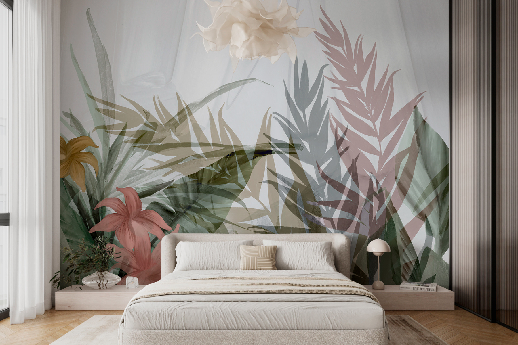 Imagínese esto: un mural que transforma su pared en un oasis de serenidad. Presentamos nuestro diseño floral abstracto con hojas en capas. Es como unas minivacaciones cada vez que entra en la habitación. Esas suaves capas de hojas y flores, casi como una suave brisa susurrando a través de un bosque tropical. Los colores apagados se mezclan en una danza relajante, haciendo que cualquier espacio se sienta fresco y tranquilo.