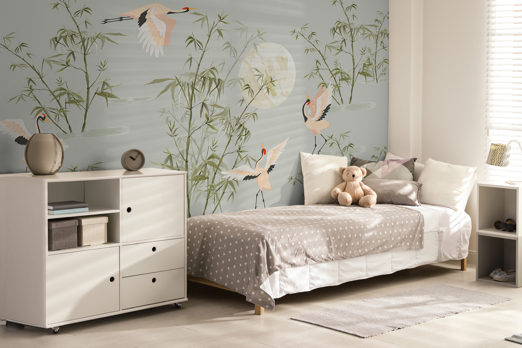 Transforme cualquier espacio en una escapada serena con este encantador mural de pared con grullas y bambú bajo un cielo iluminado por la luna. Es como invitar a la naturaleza a entrar en casa y, seamos sinceros, ¿a quién no le gustaría contemplar una escena tranquila a la luz de la luna durante esos largos días de trabajo desde casa? Imagínatelo: contempla el elegante vuelo de las grullas y siente cómo te invade la calma. Es lo bastante caprichoso como para provocar ensoñaciones, pero lo bastante realista como para encajar perfectamente en cualquier habitación. Renueva tus paredes: no es sólo decoración, ¡es una experiencia a punto de suceder!
