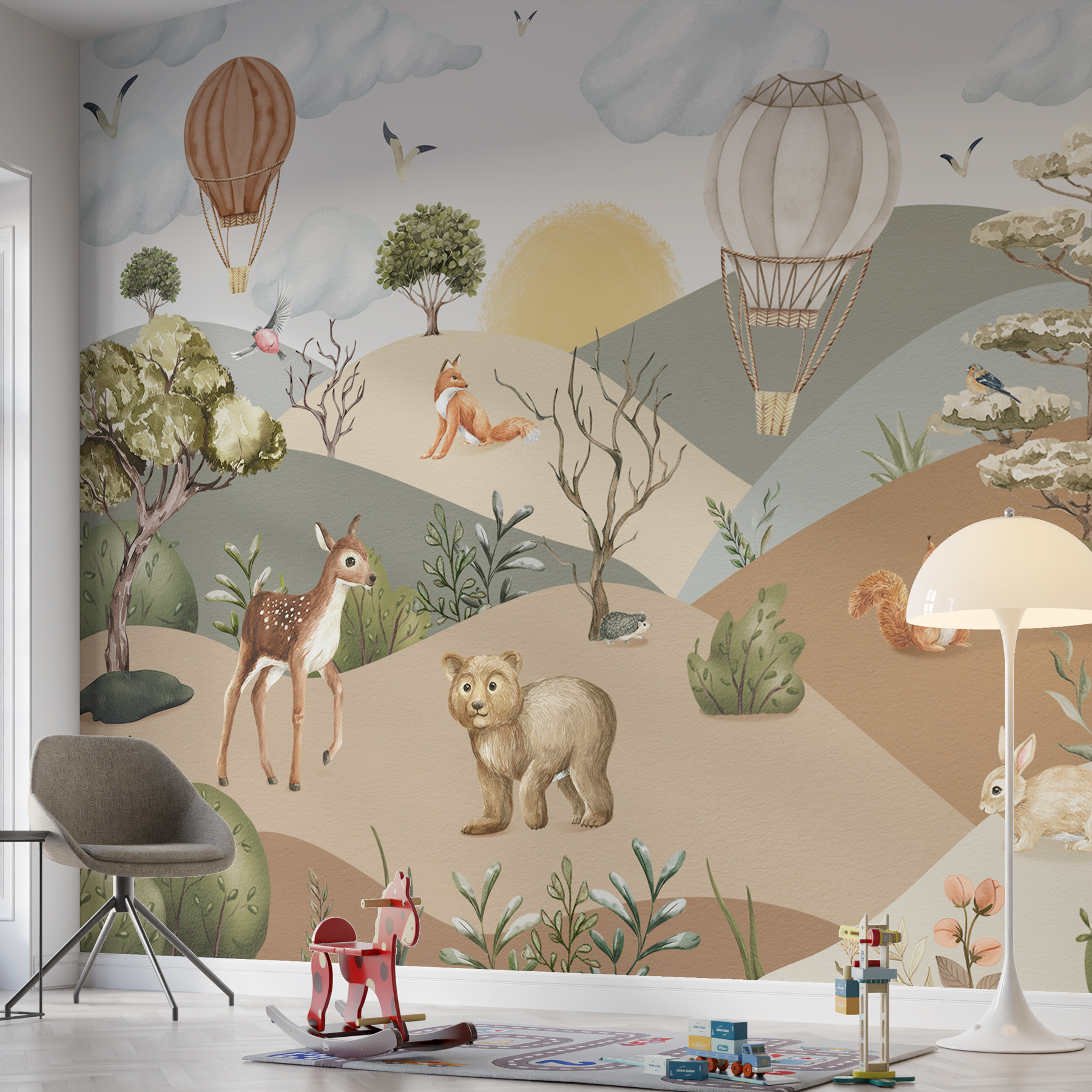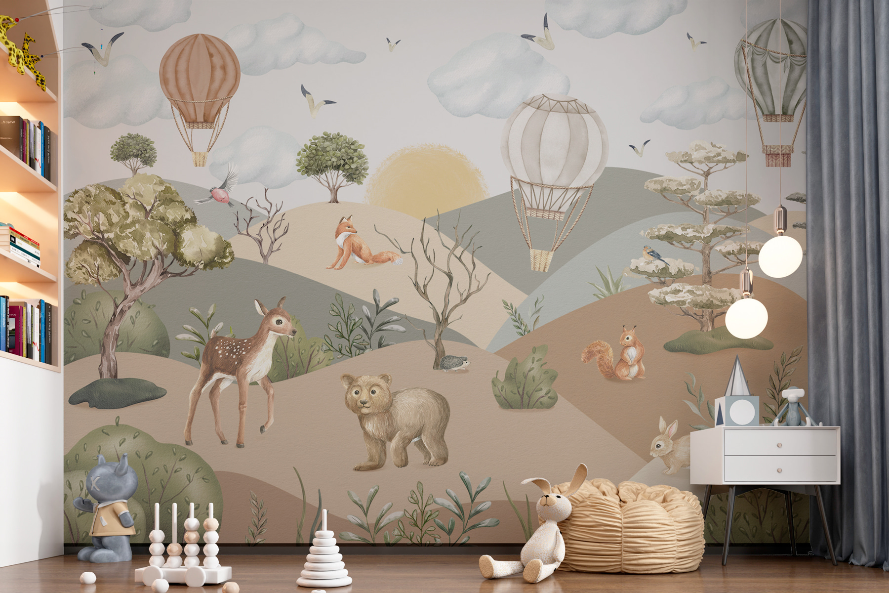 Transforma una habitación en una caprichosa aventura con este cautivador mural de pared. Es como adentrarse en un paisaje de ensueño donde los animales -piensa en curiosos ciervos y juguetones zorros- retozan bajo un cielo salpicado de encantadores globos aerostáticos. Perfecto para una habitación infantil o un rincón de relax, está lleno de toques alegres. Imagina despertarte con la dulce mirada de un oso o con una alegre ardilla comiendo. Los tonos apagados y los juguetones personajes crean un ambiente tranquilo, a la vez que despiertan la imaginación y la alegría. Además, ¡es un fantástico tema de conversación!