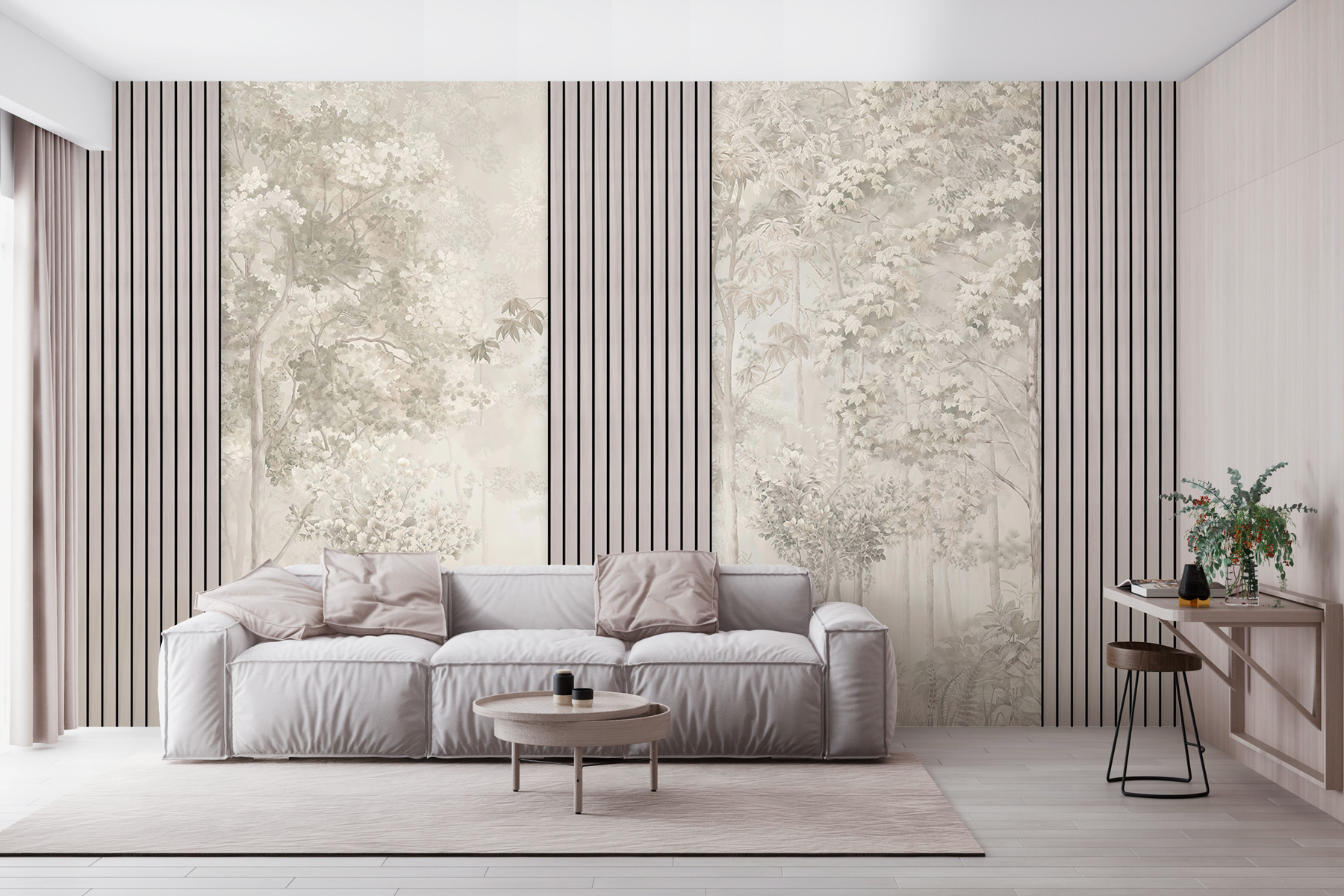 Transforme cualquier habitación en una escapada serena con este mural que presenta árboles elegantes y flores delicadas. Imagínese disfrutar del suave ambiente que crea, casi como si una arboleda pacífica se hubiera instalado en su espacio. Los tonos suaves y el diseño de ensueño evocan sentimientos de tranquilidad, perfectos para relajarse después de un largo día o fomentar la conversación durante las reuniones. Tanto si se trata de un acogedor rincón de lectura como de un animado salón, este mural aporta calidez y carácter. Al igual que una suave brisa, aporta energía fresca sin exagerar, porque ¿a quién no le gusta un poco de naturaleza en el interior?