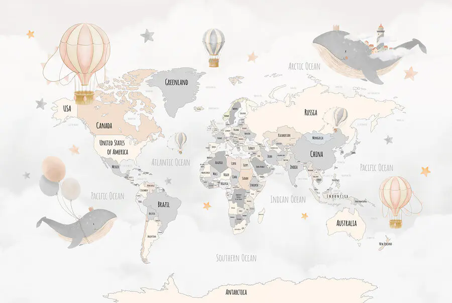 Transforma cualquier habitación en una escapada de ensueño con este encantador mural de pared que presenta un mapa del mundo salpicado de caprichosos globos aerostáticos y juguetonas ballenas. Imagina a tus pequeños aventureros contemplando este encantador diseño, despertando su imaginación y sus sueños de lugares lejanos. Los colores suaves crean un ambiente tranquilo, perfecto para una habitación infantil o un cuarto de juegos. Es como un suave recordatorio de que hay que explorar el mundo, aunque sólo sea soñando despierto. ¿Quién no querría que una ballena flotante le guiara hacia nuevas aventuras? Deja que este mural inspire historias divertidas y creatividad sin fin en tu espacio.