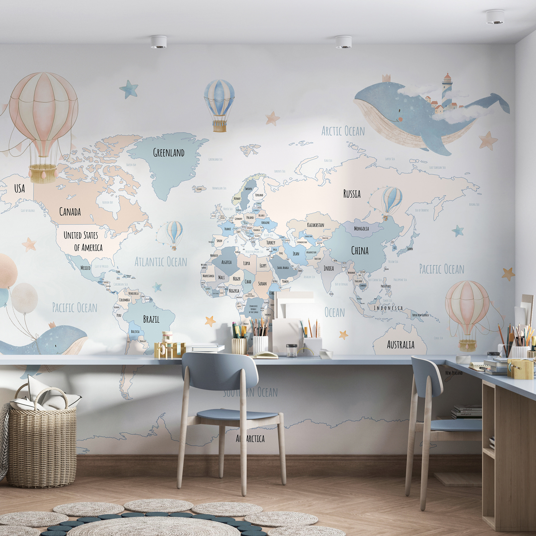 Imagina añadir un toque de fantasía a la habitación de tu hijo con este impresionante “Mural de pared Globo aerostático azul y blanco”. Es perfecto para despertar la imaginación de los más pequeños, con encantadores globos aerostáticos, detalles de mapas y adorables animales. Imagina el resplandor de una suave luz vespertina proyectando suaves sombras, haciendo que los cuentos de antes de dormir parezcan aventuras globales. Cada detalle promete convertir una pared en un pasaporte a los sueños: los niños pueden señalar Brasil o Australia y dejar volar su curiosidad. No es sólo un mural; es una invitación diaria a preguntarse, explorar y soñar a lo grande. ¿Y esos suaves tonos pastel? Combinan a la perfección con cualquier decoración, aportando un ambiente sereno pero divertido. Perfectos para infundir ese toque mágico a guarderías y salas de juegos.