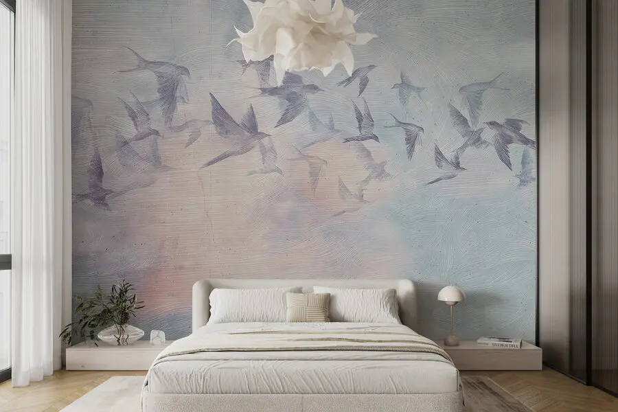 Imagine despertarse con la serena visión de delicados pájaros pintados en acuarelas de ensueño, revoloteando por su pared. Eso es exactamente lo que ofrece el mural “Bandada de pájaros volando en el cielo”. No es sólo una obra de arte, es una escena sacada de una tranquila ensoñación, que captura el suave fluir de la naturaleza.