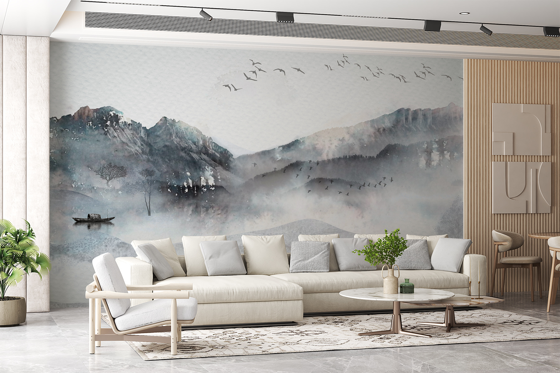 Imagínese entrar en una habitación y ser recibido por un sereno grupo de pájaros que surcan un cielo de ensueño, flotando por encima de un brumoso paisaje forestal. Este mural de acuarela no es sólo arte, es una experiencia. La bruma tranquilizadora, las suaves colinas y las montañas lejanas son como un suave susurro de la naturaleza. Es casi como si pudieras oír el susurro de los árboles y sentir el aire fresco de la mañana rozando tu piel.