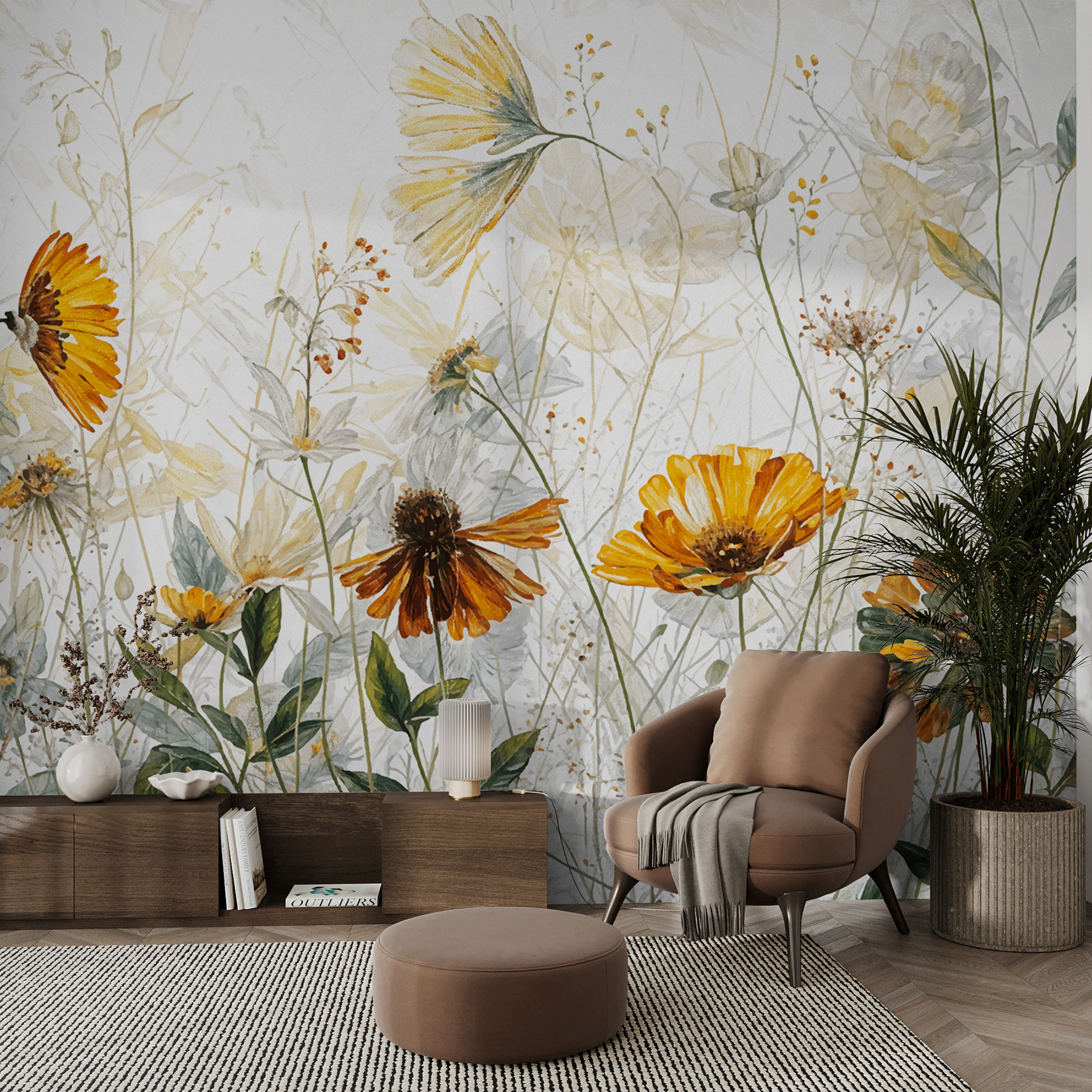 Imagine despertarse en un prado de flores silvestres todos los días: eso es lo que este mural “Flores silvestres bailando en la brisa” aporta a su espacio. Es como si sus paredes le dieran un suave abrazo de la naturaleza. Las suaves tonalidades y el delicado diseño de acuarela hacen que parezca que las flores se mecen ante tus ojos, calmantes y preciosas. Es perfecto para añadir un toque de fantasía a tu salón o para aportar serenidad a tu rincón de lectura. Tiene esa forma mágica de hacerte sentir relajado e inspirado, como un soplo de aire fresco en el interior.
