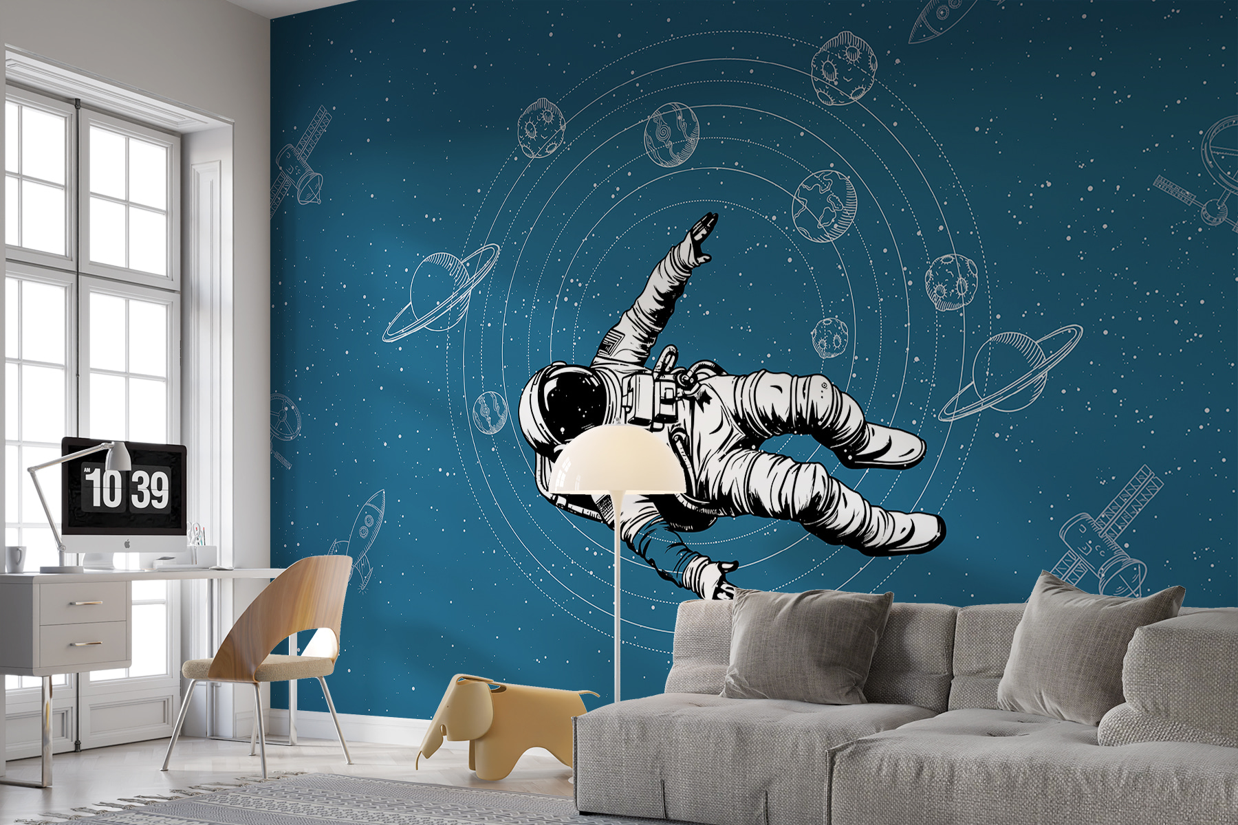 Anime su espacio con este mural de pared “Astronauta flotando en el espacio”, que forma parte de nuestra colección de murales de pared Galaxy. Imagínese adentrándose en el cosmos cada vez que entre en la habitación. El fondo azul profundo, salpicado de estrellas y planetas, es perfecto para añadir una sensación de aventura y asombro a cualquier pared. Tanto si se trata de la habitación de un niño, donde los sueños de viajes espaciales cobran vida, como de su propio refugio personal, este mural aporta serenidad y un toque de magia. Imagínese haciendo una pausa en un día ajetreado y flotando, ingrávido, entre las galaxias. Puro escapismo, ¡justo en su pared!