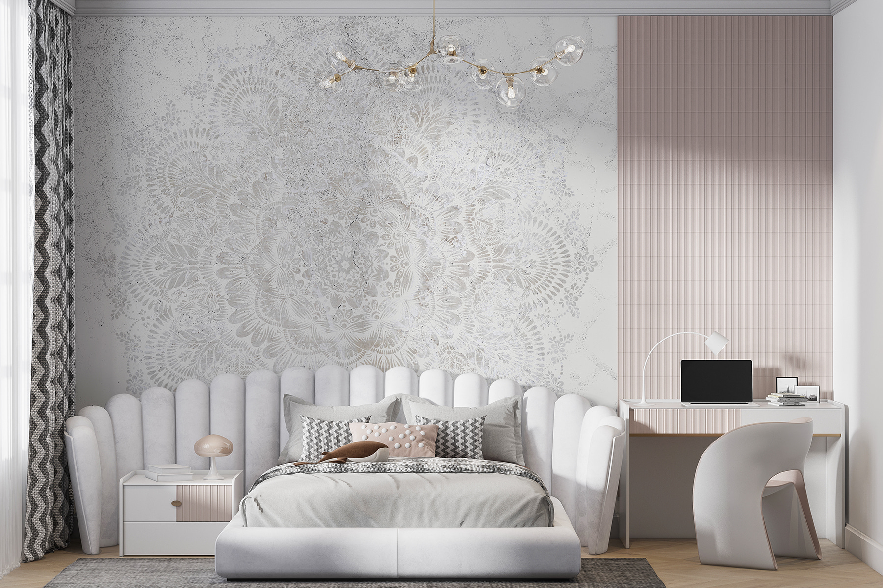Imagine que entra en una habitación y le recibe una serena danza de motivos blancos en la pared. Es como si alguien susurrara elegancia y ésta resonara en espirales y bucles. Este mural de motivos circulares parece casi vivo, como una suave nevada en un día de calma perfecta. Sus amigos pensarán que es el copo de nieve más elegante del mundo. Juega con la luz de la forma más suave, proyectando susurros de sombra y creando un ambiente acogedor y caprichoso. Perfecta tanto para los que sueñan despiertos como para los entusiastas del estilo. ¿Te preguntas qué historias podría contar?