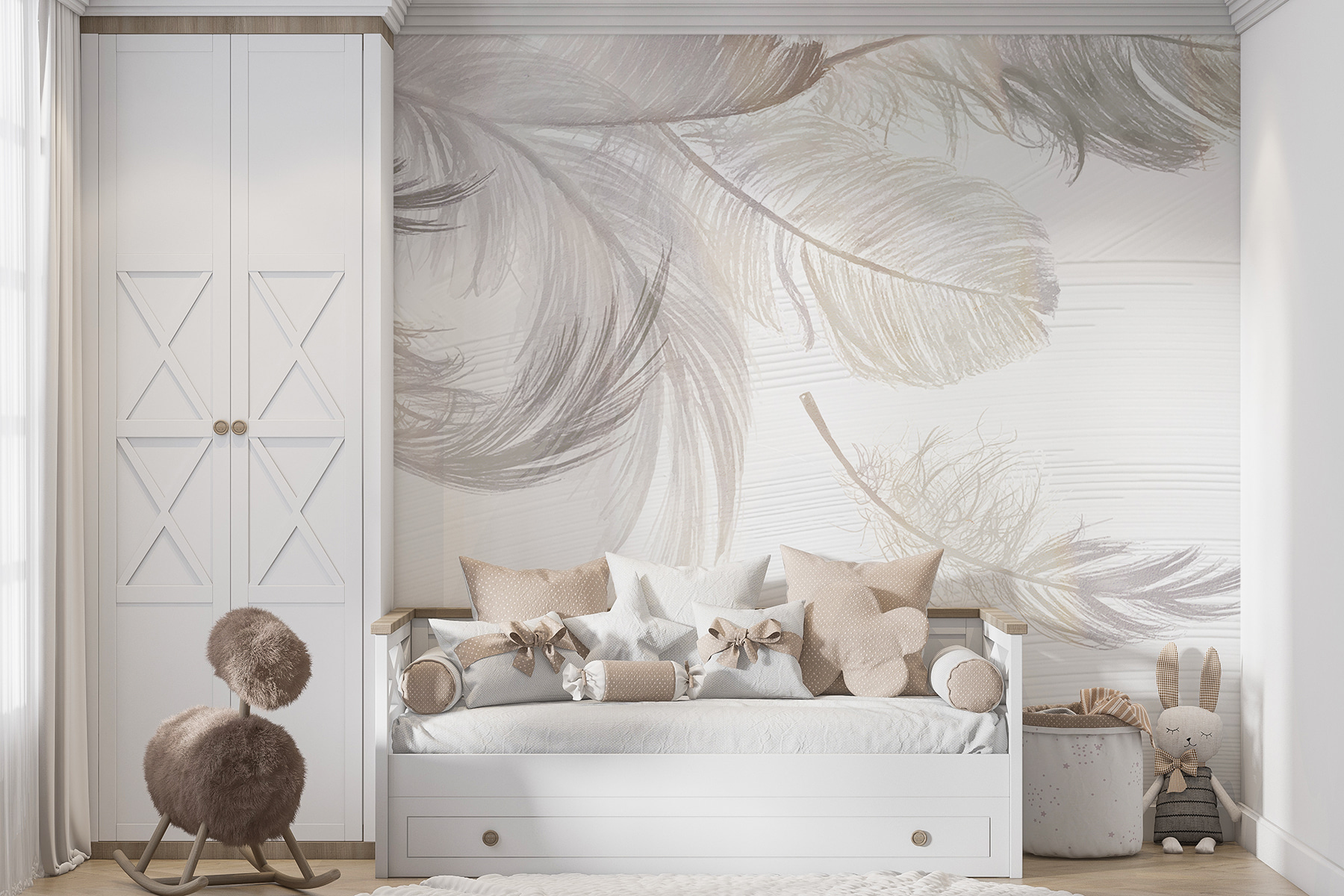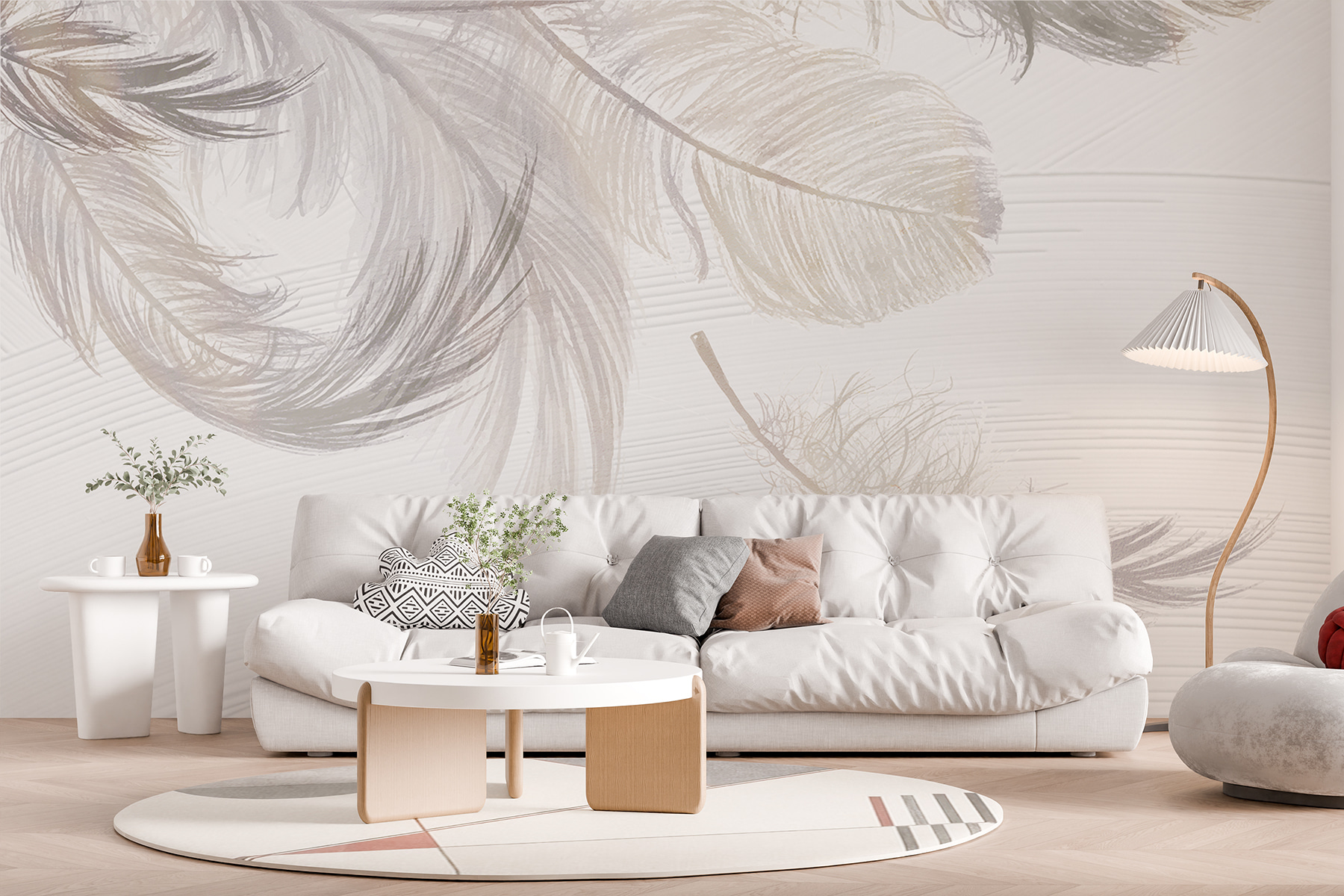 Imagínese entrar en una habitación donde le abrace el suave susurro de la naturaleza. Este mural, con suaves plumas blancas sobre una superficie tranquila, invita a una sensación de paz y elegancia. Es como un soplo de aire fresco que anima el espacio sin esfuerzo. Perfecto para un rincón de lectura acogedor o un dormitorio tranquilo, establece un tono sereno que es perfecto para esos momentos de relajación. Imagínese tomando el té con un buen libro, sintiendo que el peso del mundo se disipa un poco. Es sutil, pero llamativo, como un suave secreto a la espera de ser descubierto. Un pequeño toque que marca una gran diferencia.