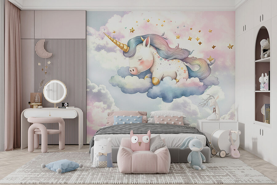 Echa un vistazo a este mural de ensueño “Unicornio durmiendo en las nubes”. En serio, es como entrar en una ensoñación esponjosa y mágica cada vez que entras en la habitación. Imagina que en tu rincón favorito aparece un adorable unicornio durmiendo sobre nubes suaves y esponjosas: qué ambiente, ¿verdad? Perfecto para añadir un toque de magia a la habitación de un niño o incluso a tu propio rincón de lectura.