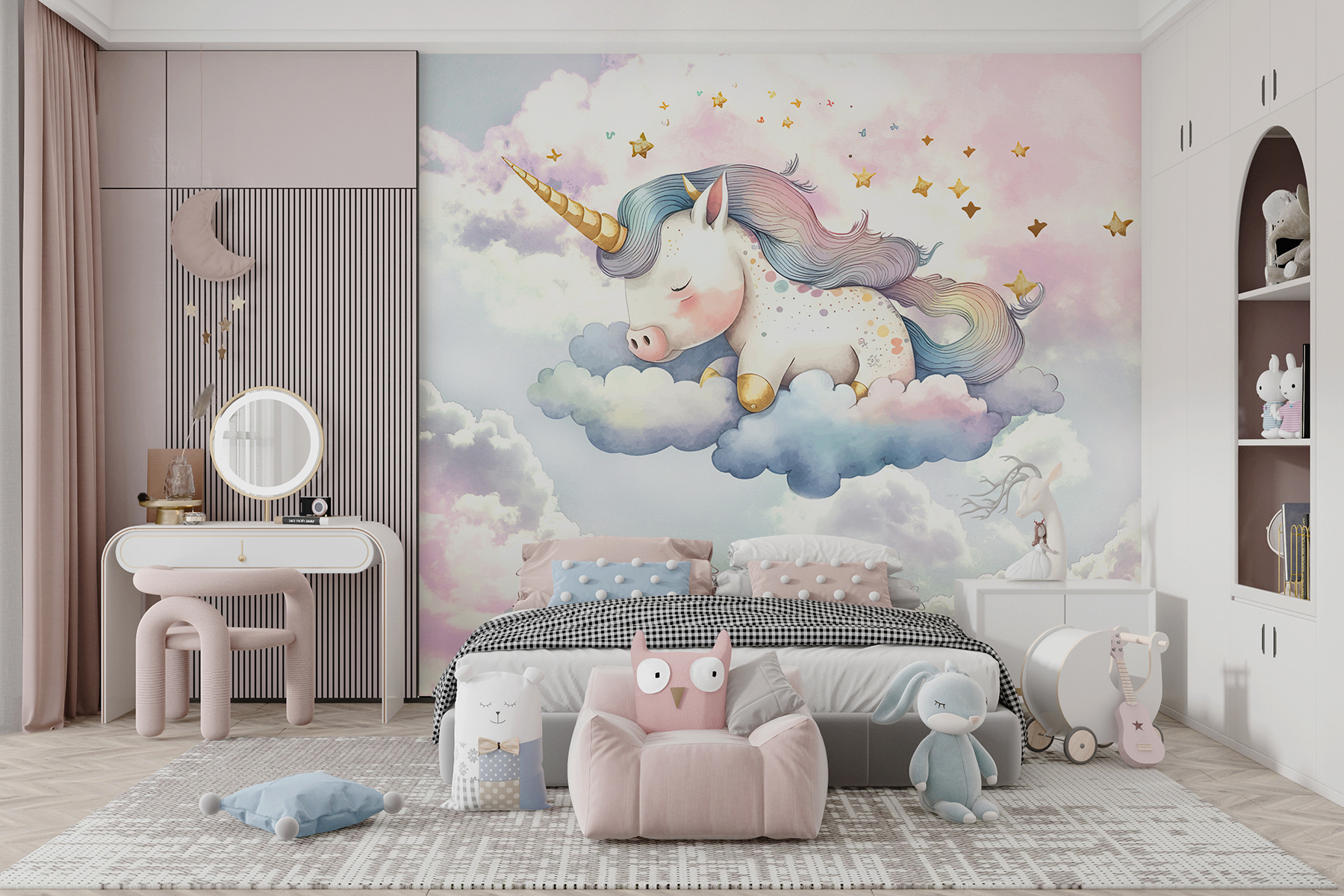 Echa un vistazo a este mural de ensueño “Unicornio durmiendo en las nubes”. En serio, es como entrar en una ensoñación esponjosa y mágica cada vez que entras en la habitación. Imagina que en tu rincón favorito aparece un adorable unicornio durmiendo sobre nubes suaves y esponjosas: qué ambiente, ¿verdad? Perfecto para añadir un toque de magia a la habitación de un niño o incluso a tu propio rincón de lectura.