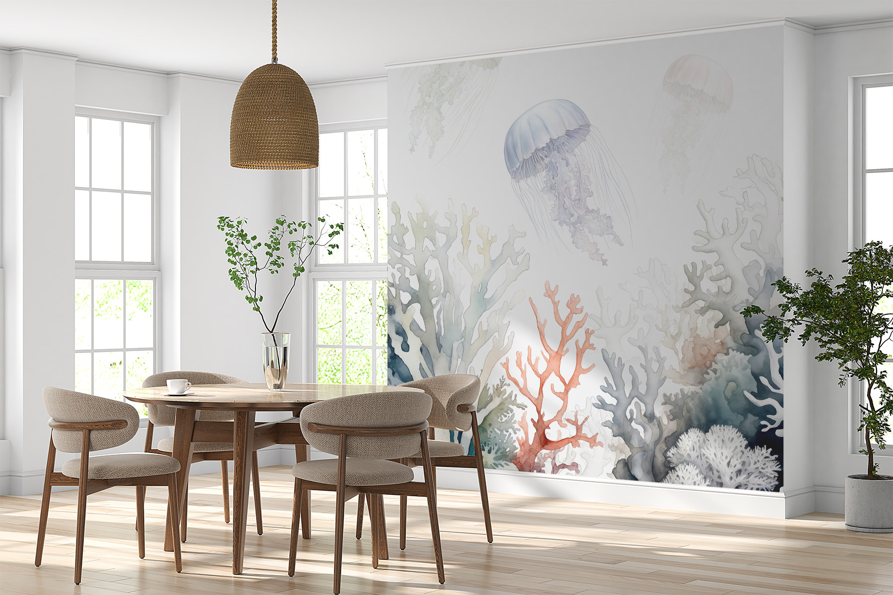 Imagínese nadando en un apacible paraíso submarino. Ese es el tipo de ambiente que este mural “Medusas a la deriva sobre corales de colores” aporta a su espacio. Es como un susurro del océano en sus paredes. Los suaves tonos de acuarela le harán sentirse relajado, casi como si pudiera oír el suave vaivén del mar. Perfecto para cualquier persona que ame el encanto costero, es un verdadero tema de conversación. Acomódate en esta serena escena y deja que tus preocupaciones se alejen con estas preciosas medusas. Un toque de color y tranquilidad en tu hogar.