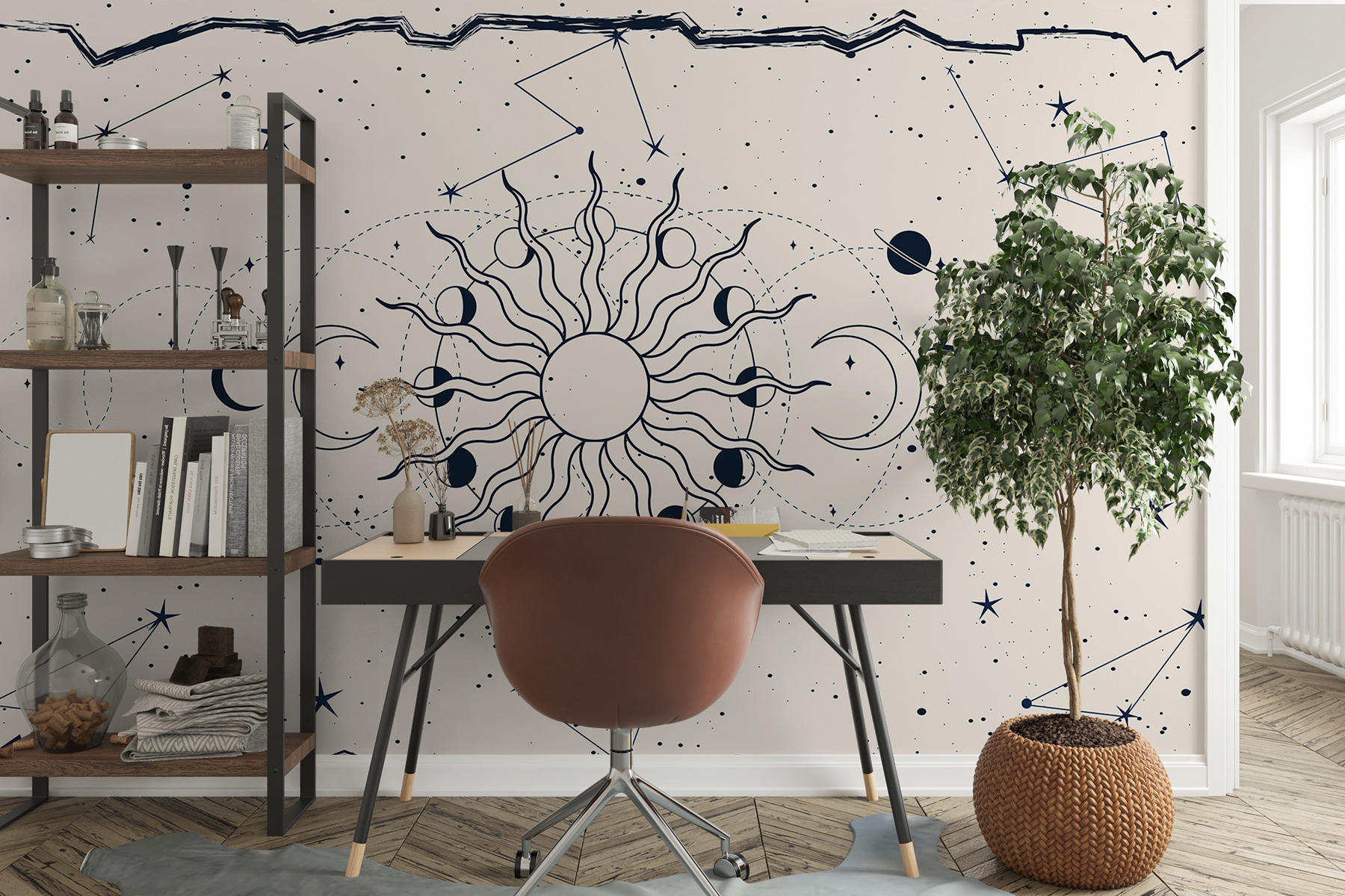 Transforma tu espacio con el encantador “Mural Dibujo del Sol y la Luna”. Este fascinante diseño reúne al dúo celestial en una juguetona danza. Imagínese entrar en una habitación donde el sol irradia calor y la luna proyecta un resplandor tranquilizador. Perfecto para un acogedor dormitorio o una vibrante sala de estar, suscita conversaciones e inspira ensoñaciones.