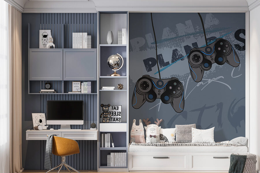 Imagínese que levanta la vista de su pantalla y ve este elegante mural gris con geniales mandos de videojuegos justo en su pared. Es como entrar en una zona de juegos futurista. Perfecto para los amantes de los videojuegos de cualquier edad, ya sea el escondite de su hijo adolescente, la nueva habitación molona de su hijo o un toque chic para el espacio de un joven adulto. El fondo gris con toques azules en los mandos aporta un toque moderno y atrevido. Es casi como si pudieras oír la intensa música del juego y sentir la energía de la acción cada vez que lo miras. Es más que una simple decoración, es un elemento que aporta personalidad y diversión a la habitación. Y, sinceramente, ¿no daría para una buena conversación cuando vienen los amigos? “Ah, ¿esto? Mi mural de juegos casual”. Además, levanta el ánimo al instante. Prepárate para sentirte inspirado, ya sea para conseguir puntuaciones altas o simplemente para levantar el ánimo.