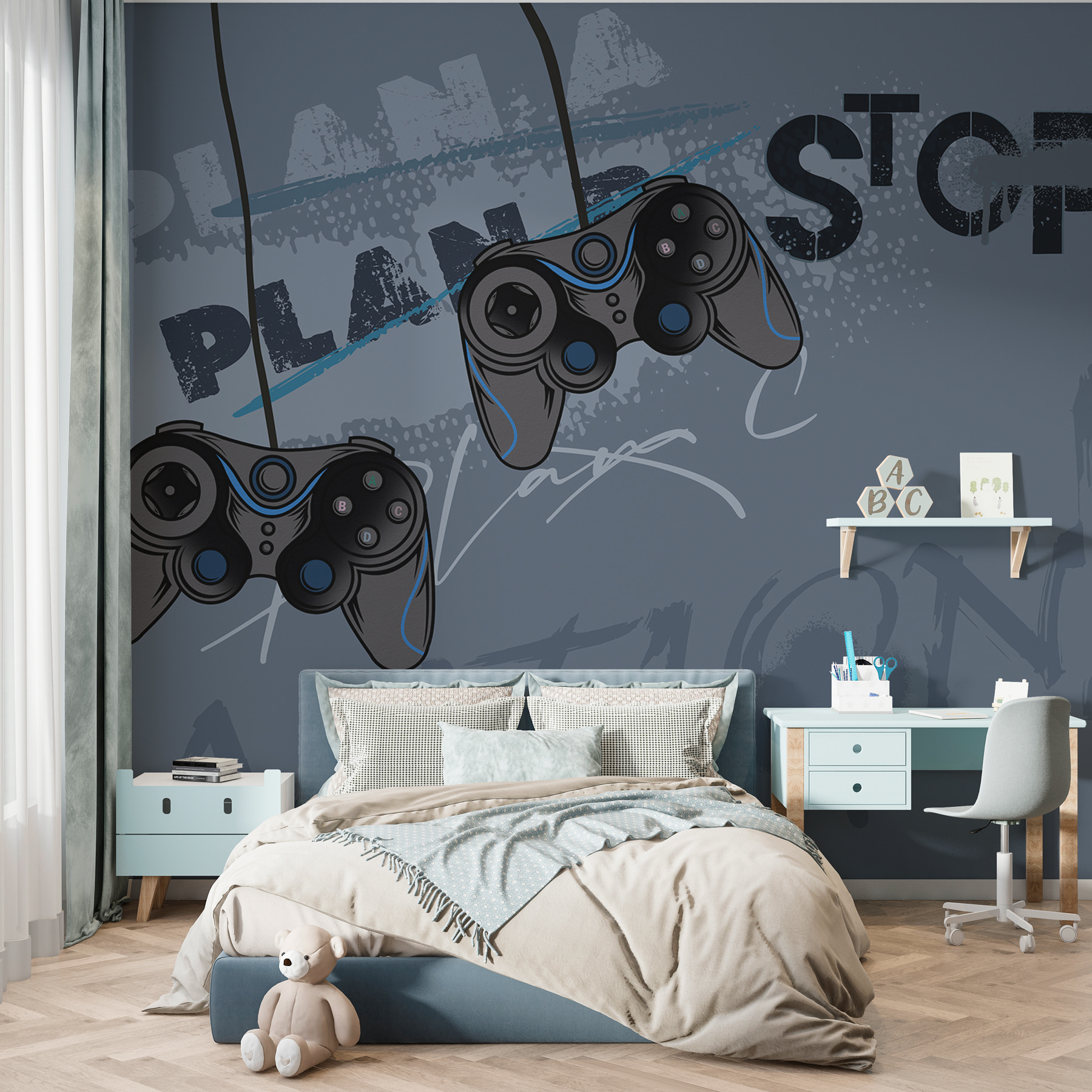 Imagínese que levanta la vista de su pantalla y ve este elegante mural gris con geniales mandos de videojuegos justo en su pared. Es como entrar en una zona de juegos futurista. Perfecto para los amantes de los videojuegos de cualquier edad, ya sea el escondite de su hijo adolescente, la nueva habitación molona de su hijo o un toque chic para el espacio de un joven adulto. El fondo gris con toques azules en los mandos aporta un toque moderno y atrevido. Es casi como si pudieras oír la intensa música del juego y sentir la energía de la acción cada vez que lo miras. Es más que una simple decoración, es un elemento que aporta personalidad y diversión a la habitación. Y, sinceramente, ¿no daría para una buena conversación cuando vienen los amigos? “Ah, ¿esto? Mi mural de juegos casual”. Además, levanta el ánimo al instante. Prepárate para sentirte inspirado, ya sea para conseguir puntuaciones altas o simplemente para levantar el ánimo.