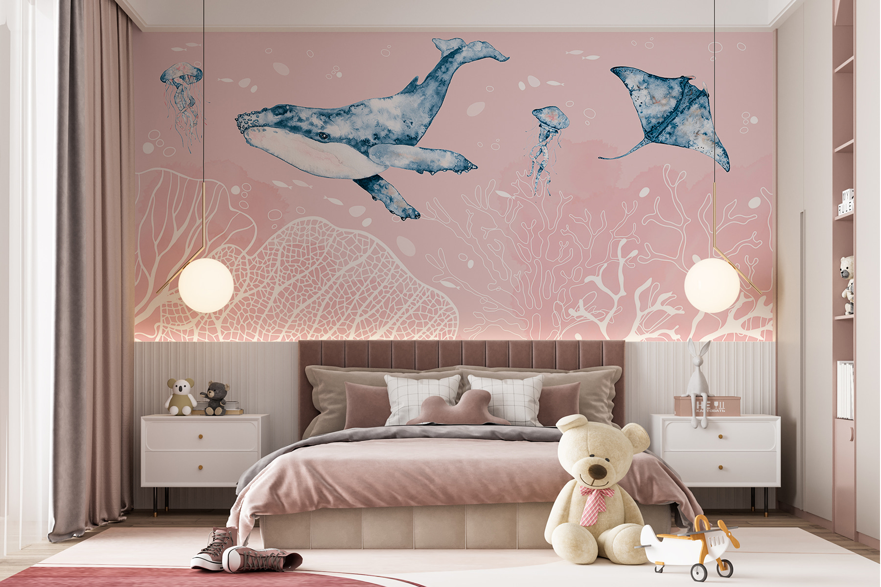 Imagine entrar en una habitación y encontrarse perdido en un sereno mundo submarino. Nuestro mural de pared “Acuarela de una ballena” es como tener un trozo del océano justo en su pared. Los tonos pastel de ensueño se mezclan sin esfuerzo, aportando una sensación de calma y fantasía. Una elegante ballena, graciosas medusas y curiosas rayas flotan a su alrededor, haciéndole sentir como si se hubiera sumergido en un mar mágico.