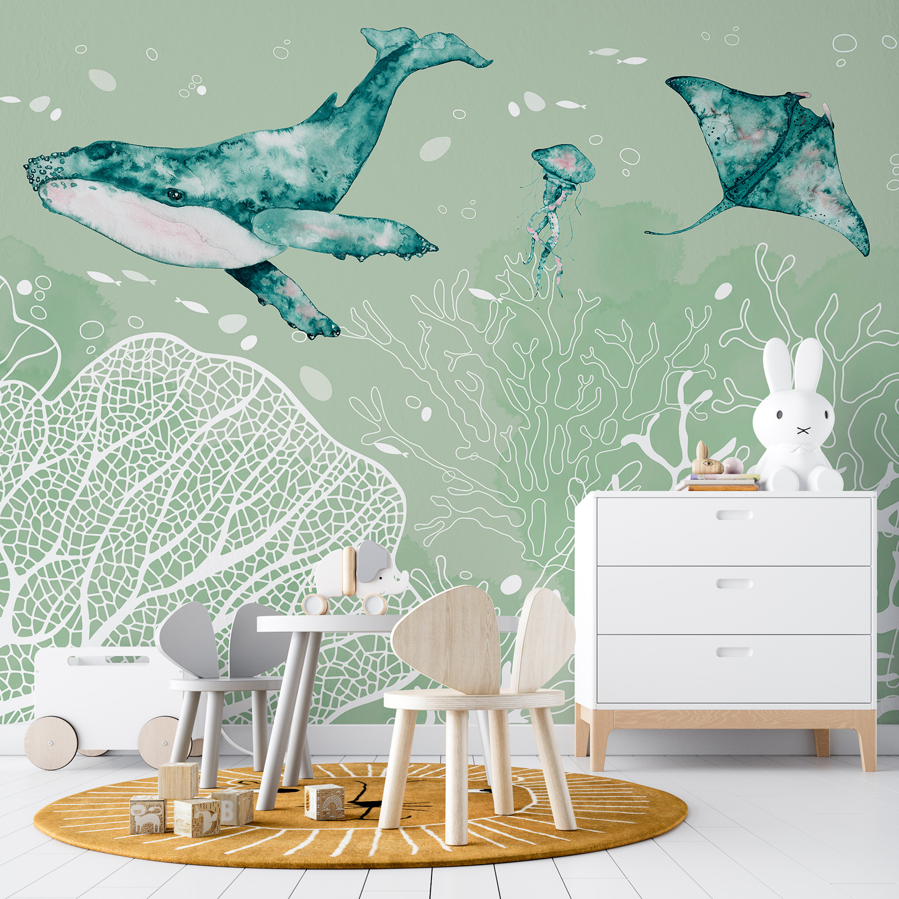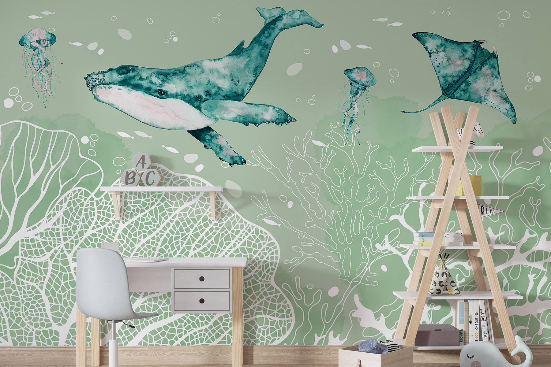 Sumérgete en la magia del océano con el mural “Mundo submarino”. En serio, es como tener un acuario sin mantenimiento, sin la comida de los peces ni los cambios de agua. Esta impresionante pieza muestra desde elegantes ballenas hasta misteriosas medusas, todas nadando en un sereno mar verde de ensueño que hará que tu espacio parezca un tranquilo refugio submarino.