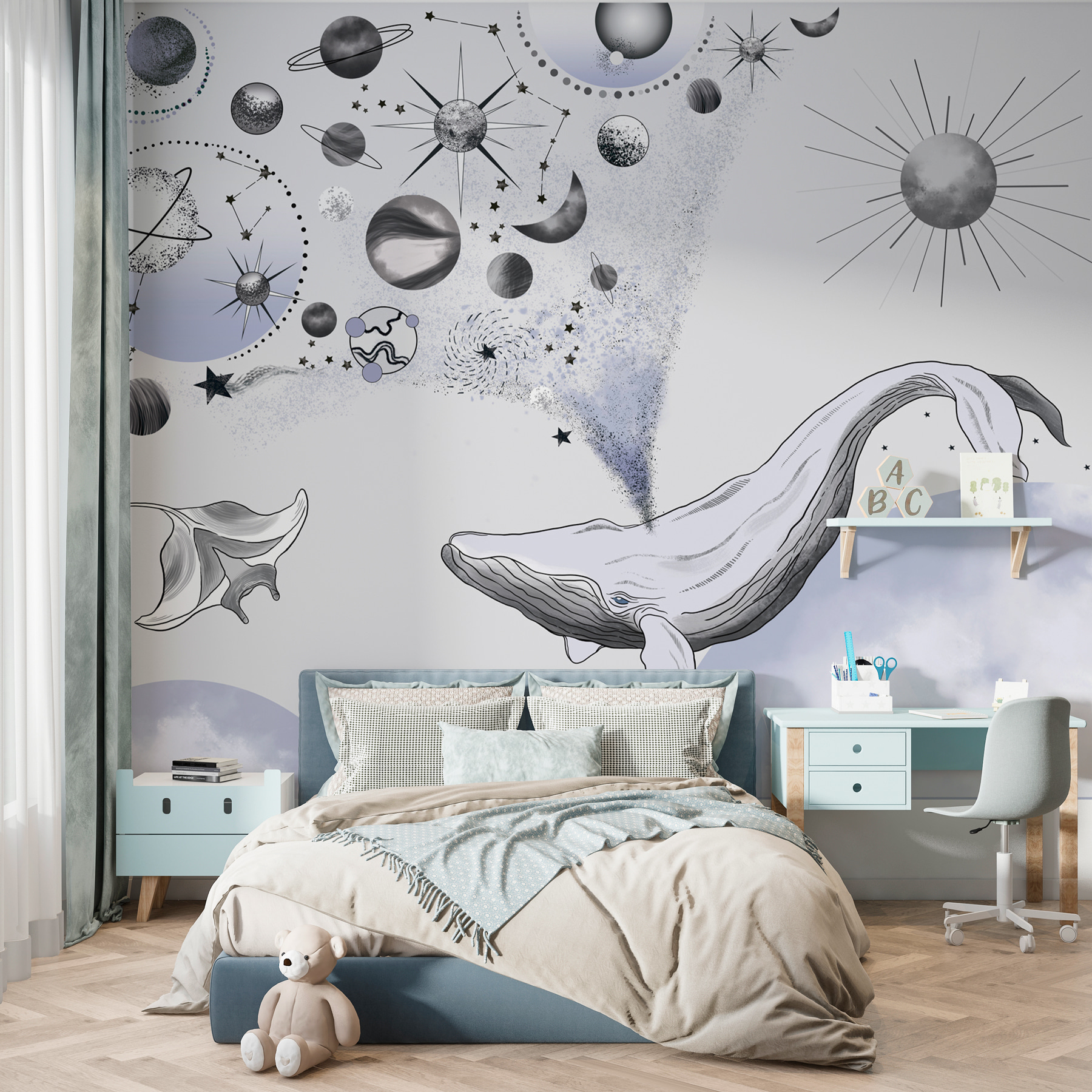 Transforme cualquier espacio con este mural de pared que parece un paseo por un país de las maravillas de ensueño. Imagínese una apacible ballena deslizándose por el cosmos, rodeada de remolinos de magia estrellada y planetas juguetones. El ambiente en blanco y negro le da un toque moderno que encaja en cualquier lugar, desde una habitación infantil hasta un acogedor rincón de lectura. Es como un tema de conversación, evocando ensoñaciones de profundidades oceánicas y cielos estrellados. Imagínese acurrucarse con un buen libro, echar un vistazo a este mural y sentir esa chispa de imaginación. Perfecto para quienes adoran un toque de fantasía en su decoración.