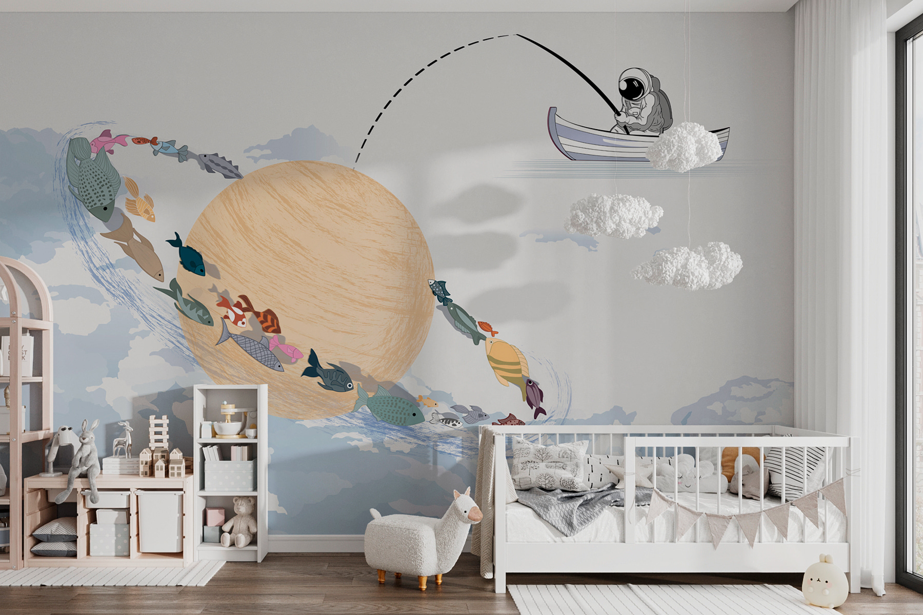 Sumérgete en un mundo donde el cielo se encuentra con el mar con este caprichoso mural de pared. Imagina un planeta gigante flotando entre nubes esponjosas, mientras peces juguetones nadan a su alrededor como si estuvieran en una aventura cósmica. El astronauta pescando tiene que ser lo más destacado: ¿quién iba a imaginar que conseguirían semejante pesca? Este mural aporta un toque de imaginación a cualquier habitación, haciéndola sentir como una acogedora escapada de la rutina diaria. Ya sea en el dormitorio de un niño o en una sala de estar peculiar, está destinado a despertar la alegría y las conversaciones. Imagínate cuántas sonrisas provocará.