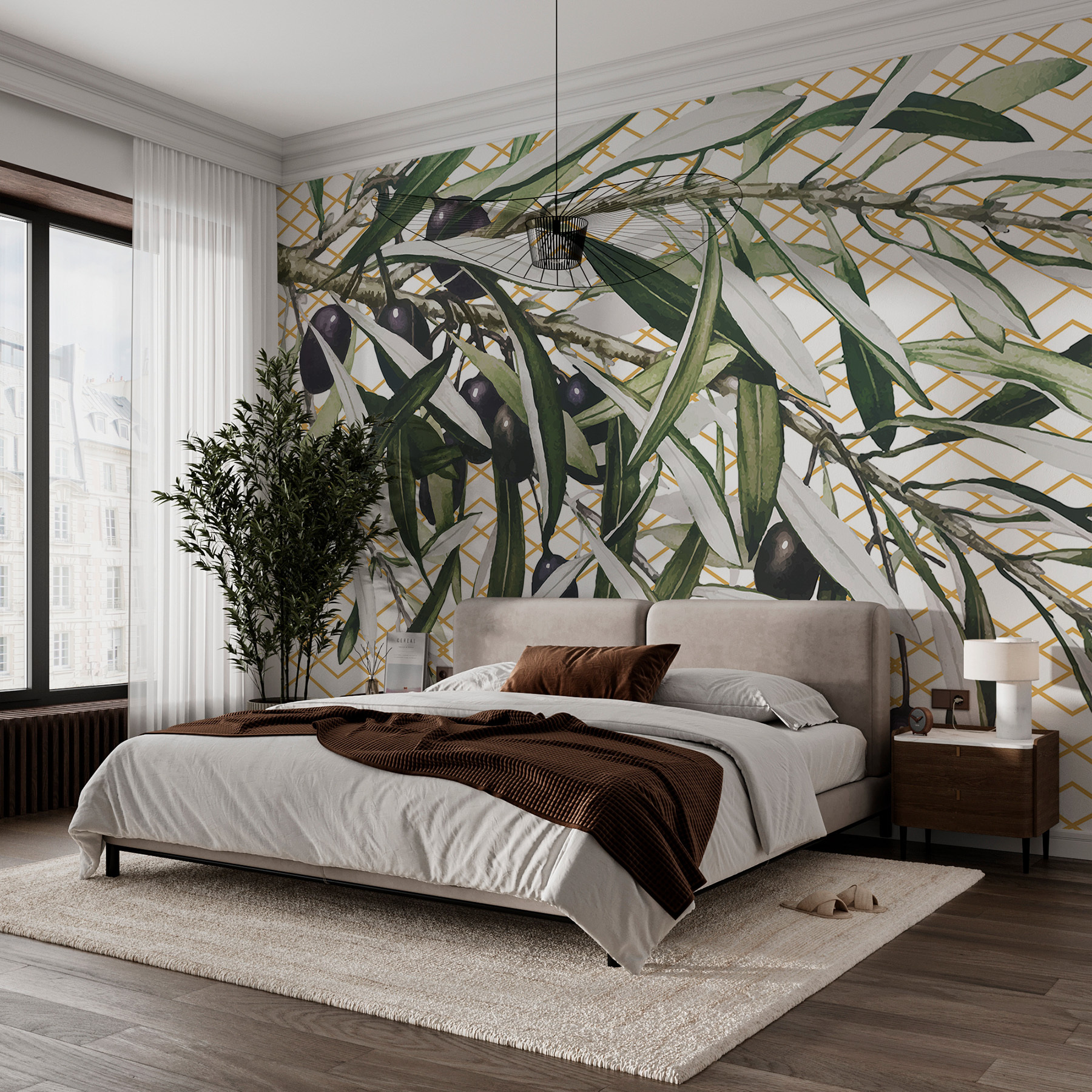 Este mural de pared es precioso. Imagine llenar su espacio con las serenas vibraciones de un olivar en su propia casa. El mural “Ramas de olivo sobre motivo geométrico” combina sin esfuerzo la naturaleza con el diseño moderno. El fondo geométrico es sutil pero llamativo, dándole ese toque contemporáneo. Es como tener lo mejor de ambos mundos: un toque de naturaleza y la elegancia del arte moderno. Imagínate celebrando una cena o simplemente relajándote en el sofá con esta relajante pieza: ¡te sentirás como en una pequeña escapada al Mediterráneo! Tanto si está tomando su café matutino como relajándose después de un día ajetreado, este mural añade un encanto suave y sofisticado a su santuario. Sinceramente, es difícil no enamorarse de las delicadas hojas y las elegantes aceitunas. Perfecto para quienes adoran la decoración inspirada en la naturaleza con un toque de diseño chic.