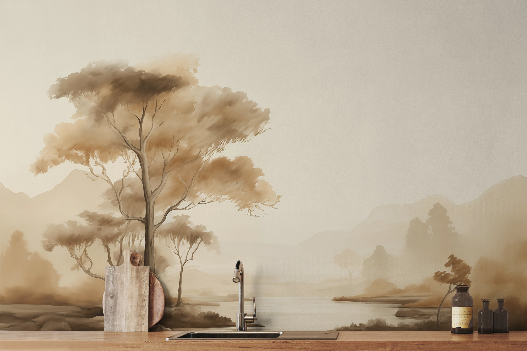 Los tonos suaves y terrosos son como un cálido abrazo. Perfecto para cualquiera que necesite escapar un poco de la rutina diaria. Hay algo intemporal en la forma en que los árboles se funden con el cielo, casi como un viejo cuento que te contarían tus abuelos. Créeme, es tan relajante como suena. Tanto si eres un amante de la naturaleza, un soñador o alguien que busca un toque de tranquilidad, este mural te cubrirá las espaldas. ¿Qué te parece llevar un trozo de naturaleza al interior de tu hogar? Es como una escapada instantánea… ¡sin hacer la maleta!