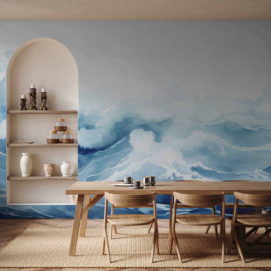 Transforme su espacio con la belleza de este mural de acuarela que representa olas y nubes. Imagínese entrar en un ambiente sereno donde el ajetreo y el bullicio se desvanecen, dejándole sólo a usted y el suave ritmo del océano. Los azules y blancos suaves evocan un ambiente tranquilo, perfecto para crear un rincón acogedor para leer o simplemente soñar despierto mientras toma su bebida favorita. Es como llevar un trozo de mar a tu casa, ¡sin necesidad de poner los pies en la arena! Perfecto para el salón, el dormitorio o incluso un rincón creativo. Prepárese para recibir cumplidos y posiblemente un poco de envidia de sus amigos.