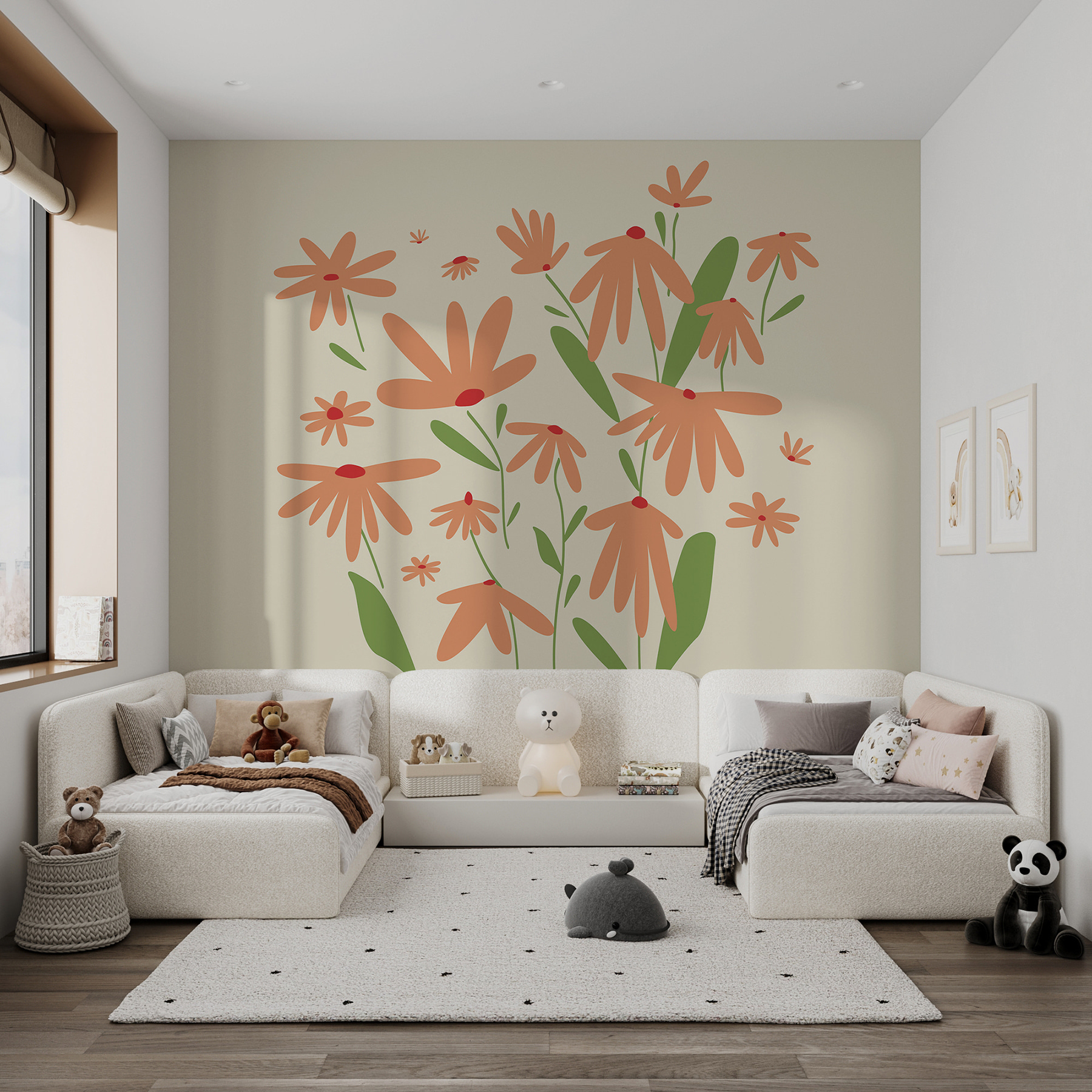 Imagina que entras en una habitación y al instante te reciben estas alegres flores, es como si dijeran: “¡Eh, bienvenido a casa!”. Tanto si estás descansando con un libro como recibiendo a tus amigos, este mural crea un ambiente acogedor y alegre. Los toques de verde añaden un toque fresco, como una suave brisa de verano.