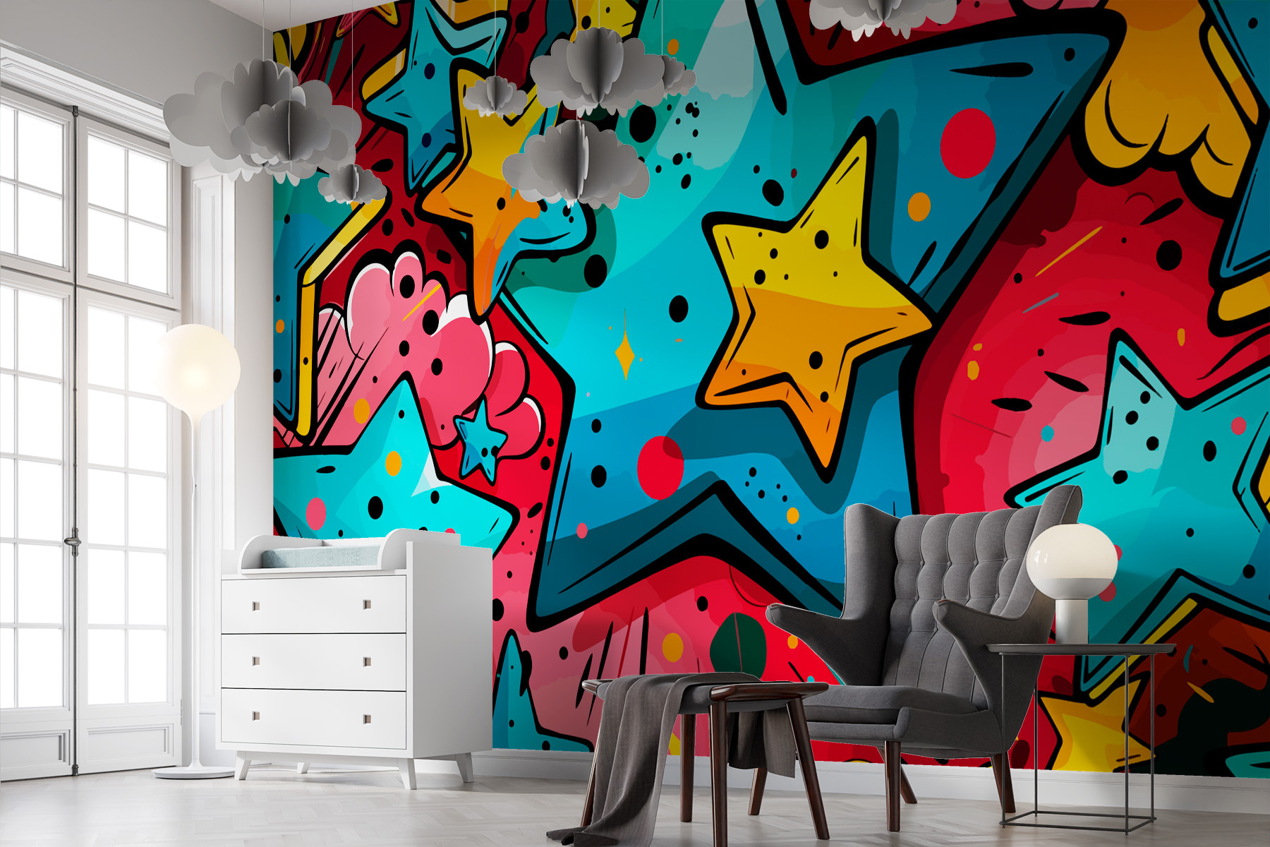Imagine entrar en una habitación y ser transportado instantáneamente a una galaxia llena de caprichos y maravillas. Eso es lo que hace el mural de pared “Colorful Star Pattern”. Es como una fiesta en la pared que nunca termina. Lleno de vibrantes estrellas y alegres estallidos de color, es perfecto para cualquiera que desee un toque de diversión en su espacio. Imagínate a un niño que entra y jadea de alegría o a un adulto que de repente vuelve a ser un soñador. Es arte que hace que la gente hable y sueñe: ¡todo el mundo preguntará por esa deslumbrante pared!