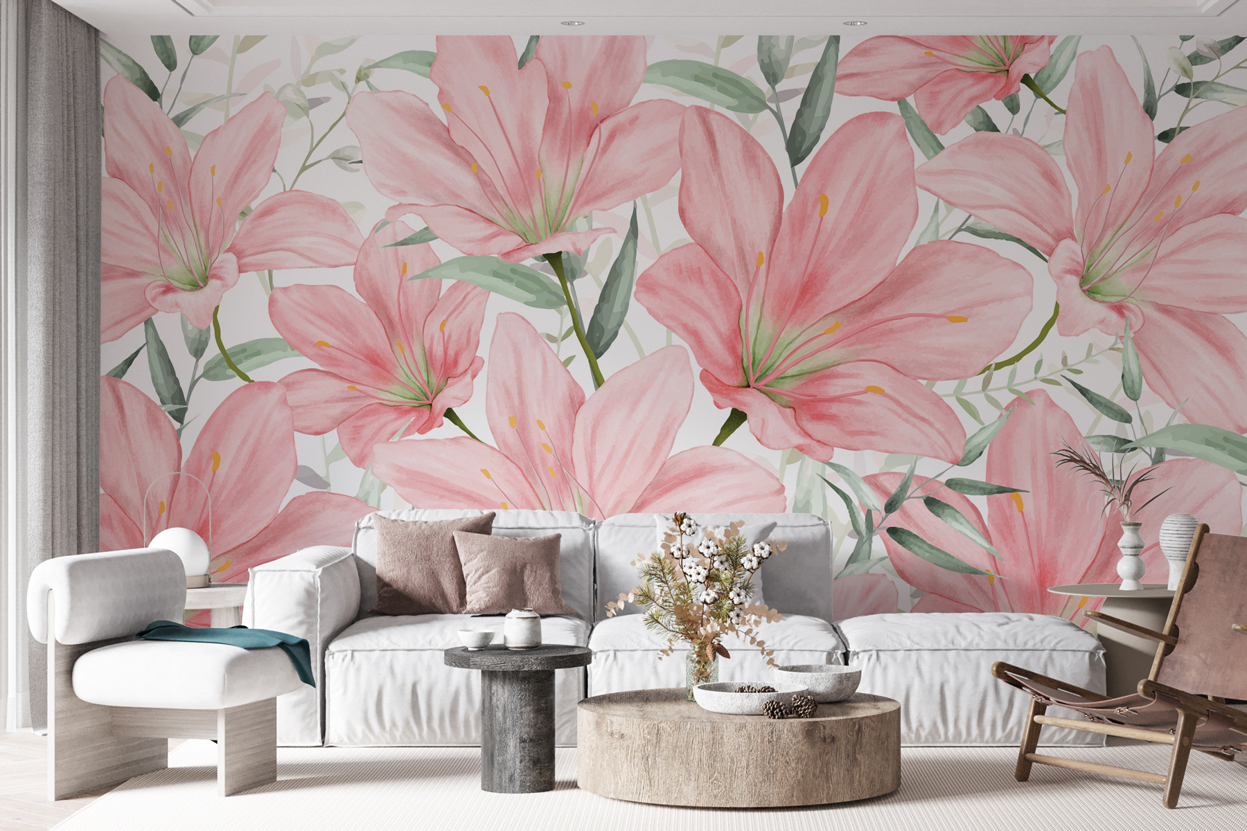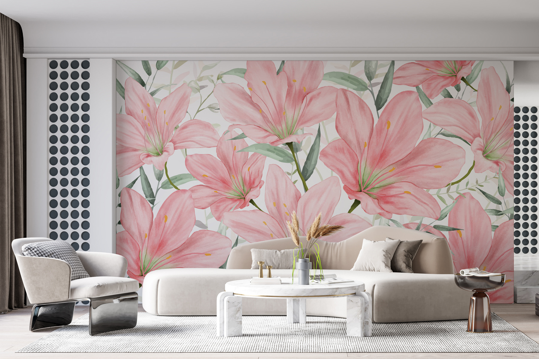 Imagínese que entra en una habitación en la que cada pared le susurra un suave saludo con lirios en flor, de un suave color rosa y elegantemente dispuestos. Este mural -llamémoslo el robaescenas- trae un poco de naturaleza al interior, con un toque de cuento de hadas. Es como celebrar una fiesta en el jardín sin preocuparse por el tiempo. Perfecto para los amantes del arte y la naturaleza, es como un abrazo personal de la mismísima Madre Naturaleza. Puede que los invitados te pregunten de dónde has sacado esa impresionante “obra de arte”, y tú sólo tendrás que sonreír, asentir con la cabeza y dejar que los lirios hablen por ti.