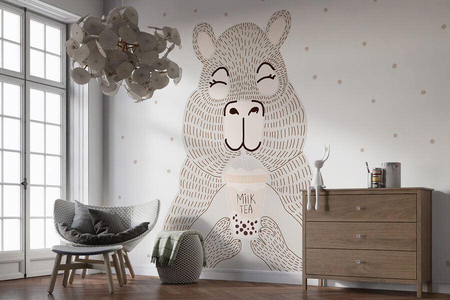 ¿Quién podría resistirse a un oso al que le gustan las burbujas de té? Este mural de dibujos animados aporta un toque de fantasía y calidez a cualquier habitación. Imagínatelo: entras después de un largo día y te recibe un encantador oso, sorbiendo un té de burbujas con una sonrisa serena. Es imposible no sentirse relajado al instante. Perfecto para dar un toque juguetón a dormitorios o cafeterías extravagantes. Tanto si eres un fanático del té de burbujas como si simplemente te encanta un buen amigo oso, este mural añade un ambiente único y acogedor a tu espacio. ¿Quién iba a decir que un oso podría ser un compañero de piso tan guay?
