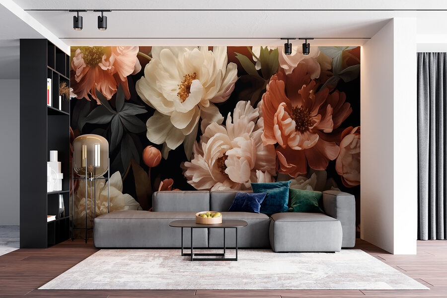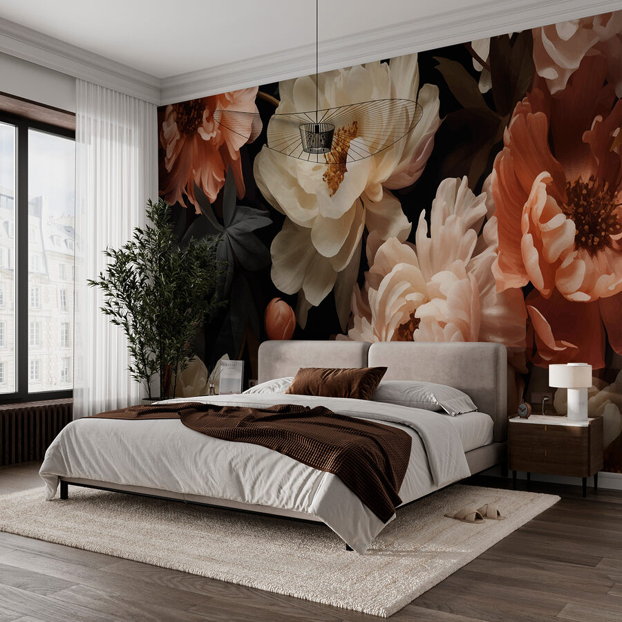Imagine entrar en una habitación y ser recibido por la elegante danza de las flores sobre un fondo rico y oscuro. Este mural trae el encanto de un jardín de medianoche al interior, donde las peonías y otras flores se mecen sutilmente, como atrapadas por una suave brisa. Es un susurro del dramatismo de la naturaleza, perfecto para crear un rincón acogedor o transformar una pared aburrida en una obra de arte. Los profundos contrastes dan una sensación de confort e intriga, como descubrir un jardín secreto en el crepúsculo, despertando una sensación de aventura y paz a la vez.