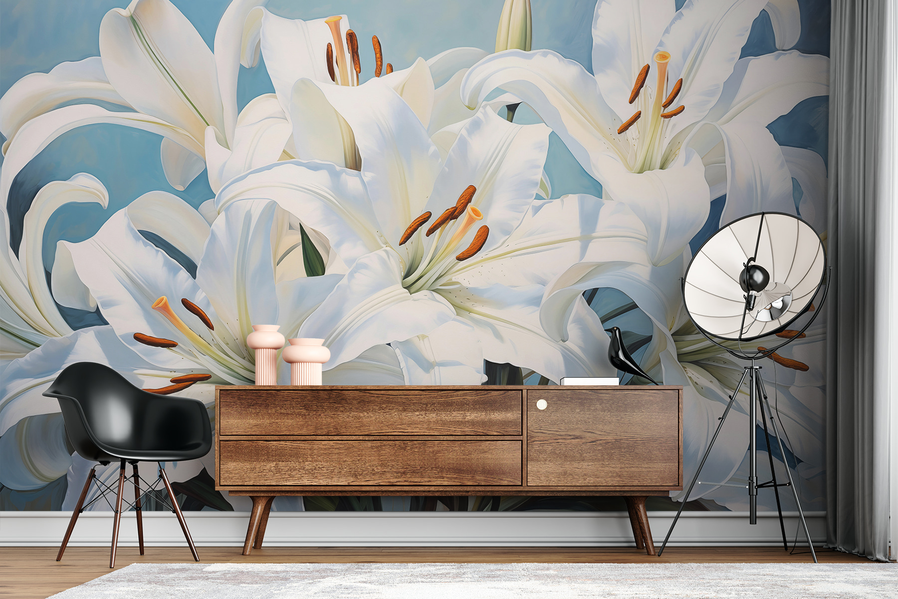 Transforme su espacio con este impresionante mural de pared, con elegantes lirios blancos en plena floración. Es como tener un jardín en la pared, aportando un toque de naturaleza al interior. Imagínese despertarse cada mañana con estas preciosas flores, como si le estuvieran susurrando: “¡Buenos días!”. Es perfecto para iluminar un rincón acogedor o para destacar en una habitación más grande. Los colores suaves crean un ambiente calmado, invitando a momentos de tranquilidad. Los amigos se pararán a admirarlo y posiblemente te pregunten dónde has encontrado una pieza tan única. Es una forma sencilla de añadir belleza sin necesidad de ser un experto en jardinería.