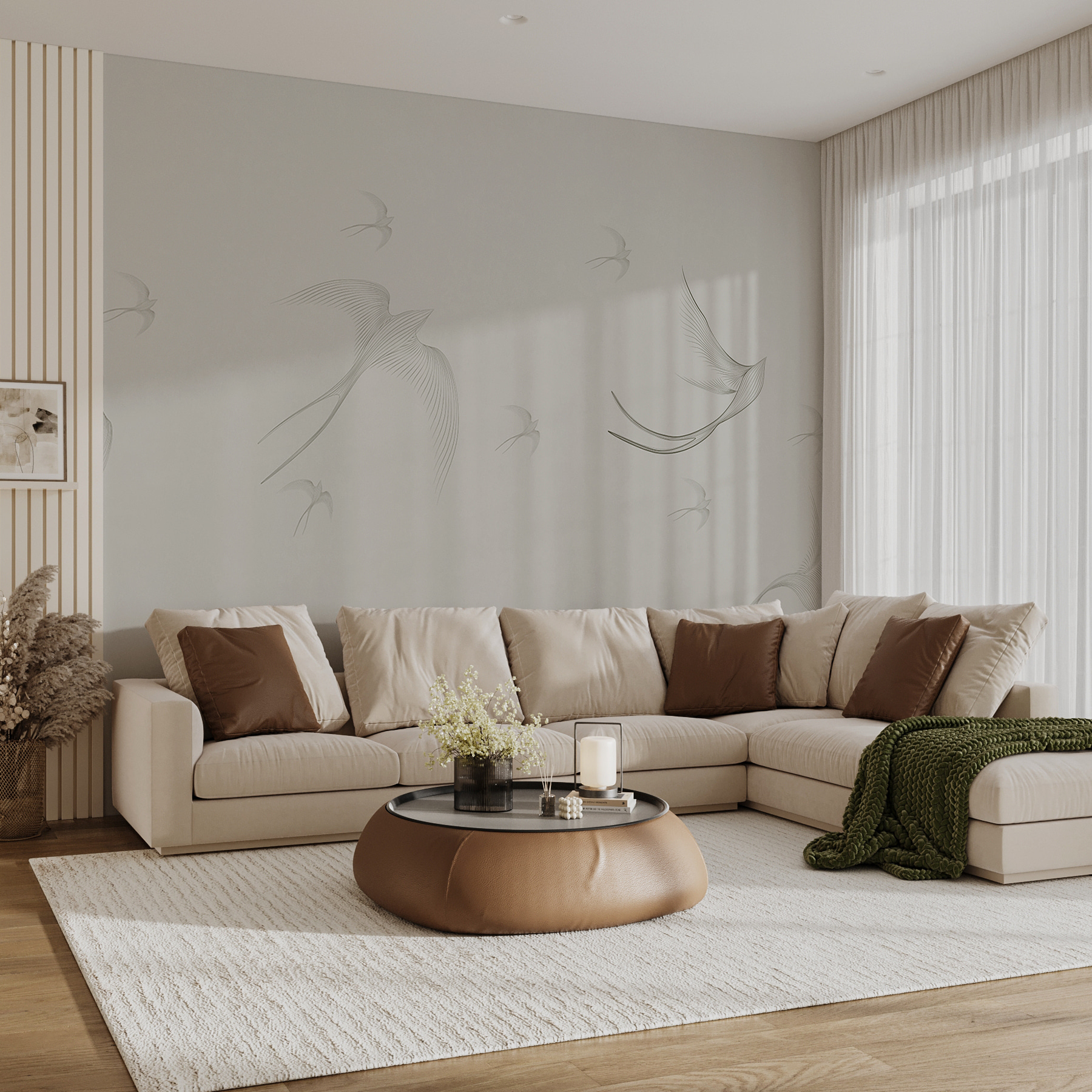 Este mural no es sólo bonito; añade un toque de estilo contemporáneo perfecto para cualquier espacio moderno. Además, es versátil: encaja a la perfección tanto si está decorando un despacho como si le está dando un aire nuevo al dormitorio. Las líneas suaves y los tonos suaves hacen que parezca que los pájaros están casi vivos, flotando dentro y fuera con una sensación de libertad contagiosa.