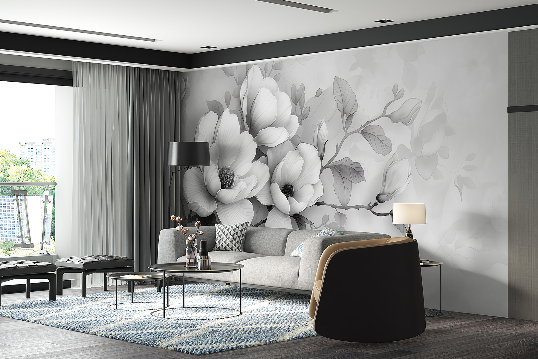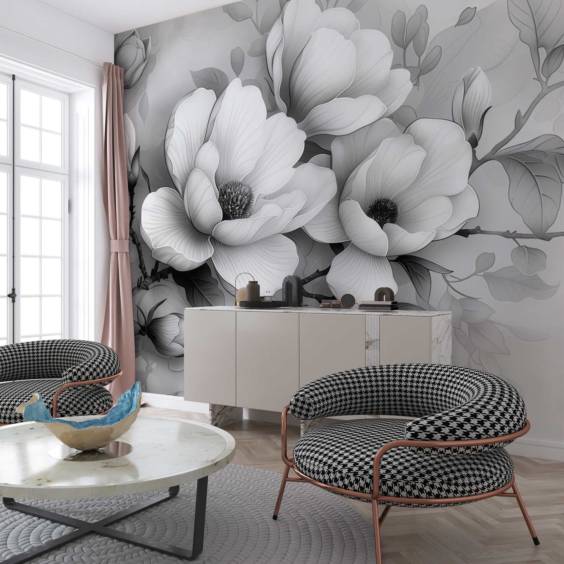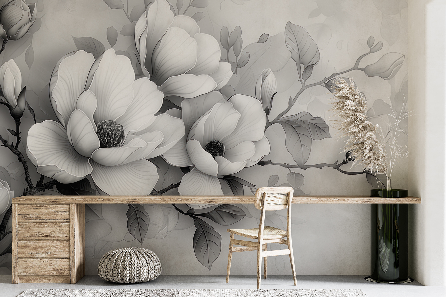 Transforme cualquier espacio con este impresionante mural de pared, “Monochrome Bloom in Serene Elegance”. Imagínese una mañana tranquila, la luz entrando y estas delicadas flores adornando suavemente su pared. El diseño atrevido pero suave equilibra sin esfuerzo la sofisticación con la belleza de la naturaleza. Es como invitar a un tranquilo jardín a tu casa, perfecto para soñar despierto o para charlar tranquilamente. Ya sea en un elegante salón o en un tranquilo rincón del dormitorio, este mural susurra elegancia sin gritar. Es un toque encantador que hace que uno se detenga, respire y aprecie el arte de la sencillez. Imagínese tomando un café cerca y sintiendo cómo le invade la serenidad.