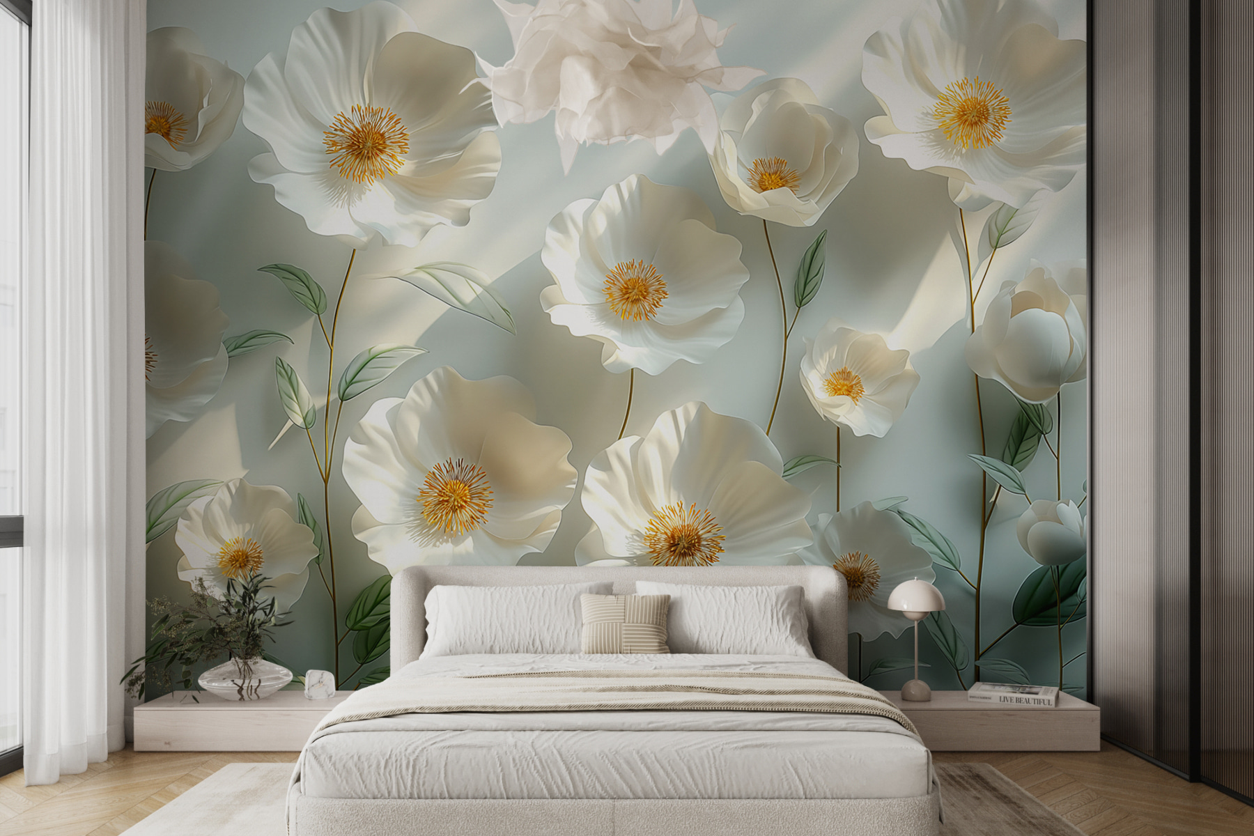 Transforme cualquier pared en una escapada al jardín con este impresionante mural que presenta un encantador grupo de flores blancas brotando alegremente entre hojas verdes. Imagina despertarte cada día y sentir que paseas por un prado iluminado por el sol. Estas flores añaden un ambiente fresco y relajante, perfecto para mañanas acogedoras o tardes frías. Ya sea en un salón, un dormitorio o incluso en un espacio creativo, harán que todo el mundo diga: “¡Vaya, mira eso!”. Además, ¿a quién no le gustan las flores que no necesitan riego? Tu pared te lo agradecerá mientras disfrutas de su belleza.