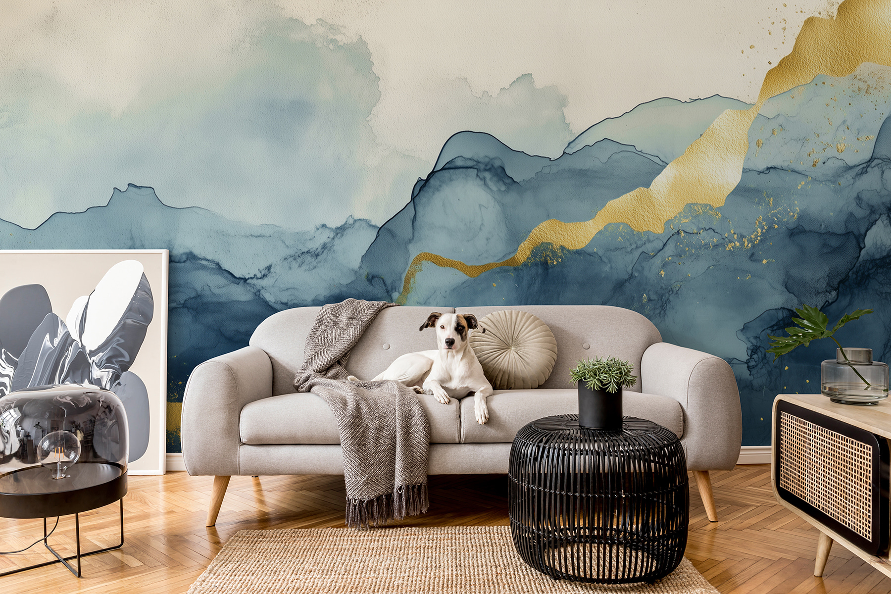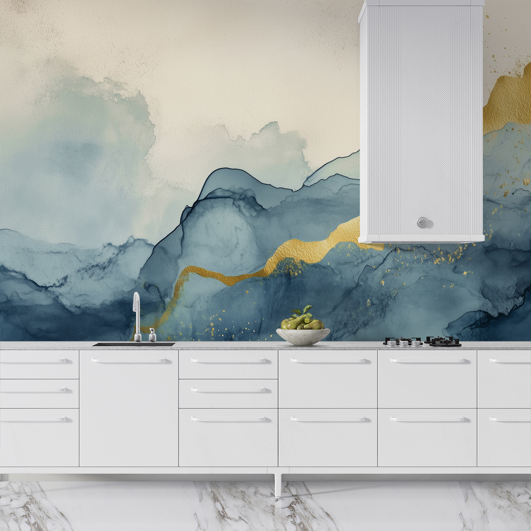 Transforme su espacio con un toque de maravilla. El mural “Misty Mountains with Shimmering Veins” es como un suave susurro de la naturaleza, que le invita a escapar a un mundo de ensueño. Imagínese entrar en una habitación y ser recibido por azules suaves y fluidos y sutiles tonos terrosos. Es casi como estar envuelto en una acogedora manta de serenidad. Perfecto para esos momentos en los que una pared necesita un poco más de dinamismo.
