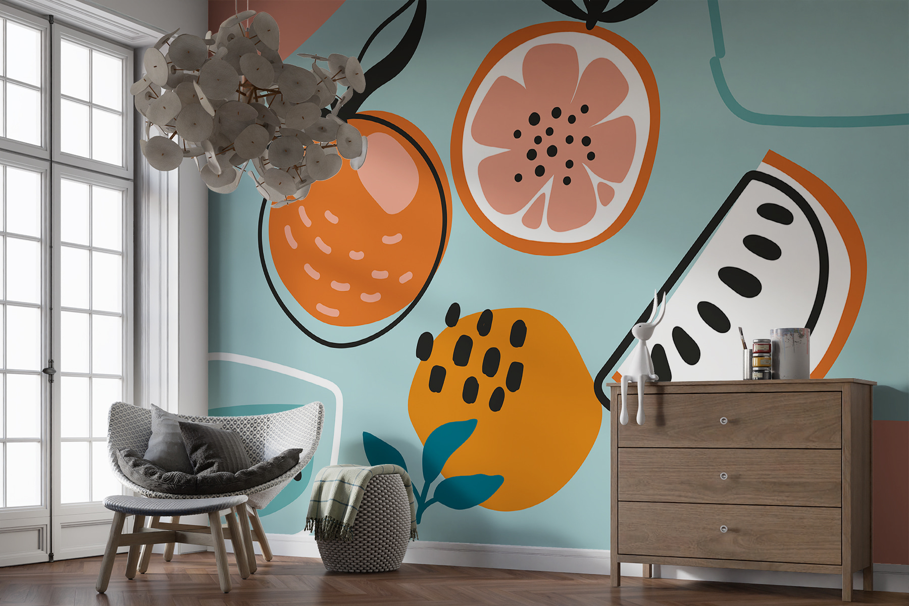 ¿Alguna vez has querido que tus paredes digan algo sin decir nada? Te presentamos el mural W01421. Este encantador mural aporta un toque juguetón a cualquier espacio, como una simpática salpicadura de color salida directamente del cuaderno de dibujo de un artista. Con rebanadas de jugosas naranjas, formas extravagantes y una explosión de vibraciones de la naturaleza, es como una sesión de improvisación artística espontánea que aterrizó perfectamente en su pared.