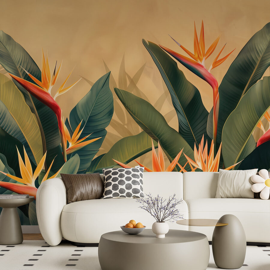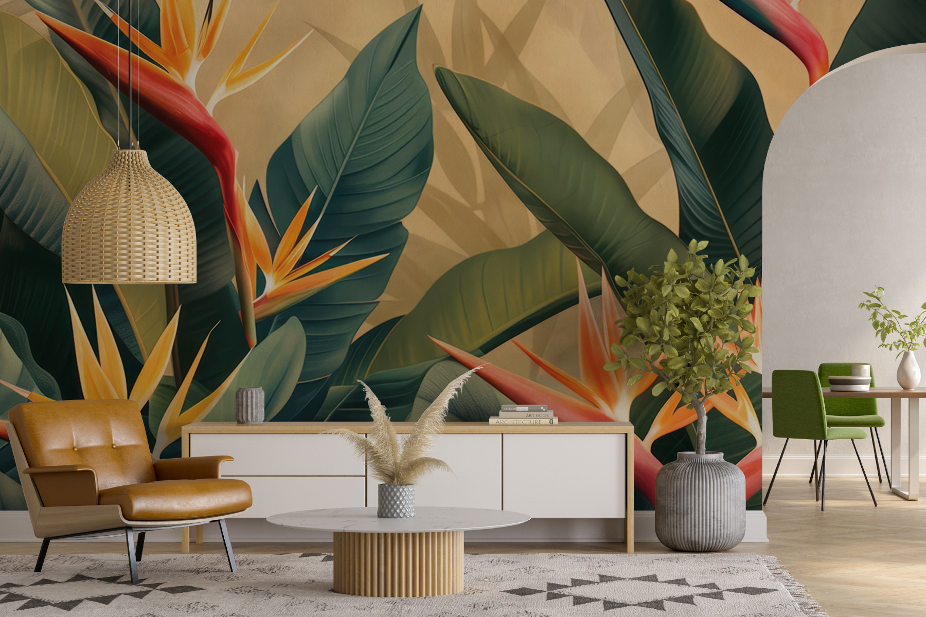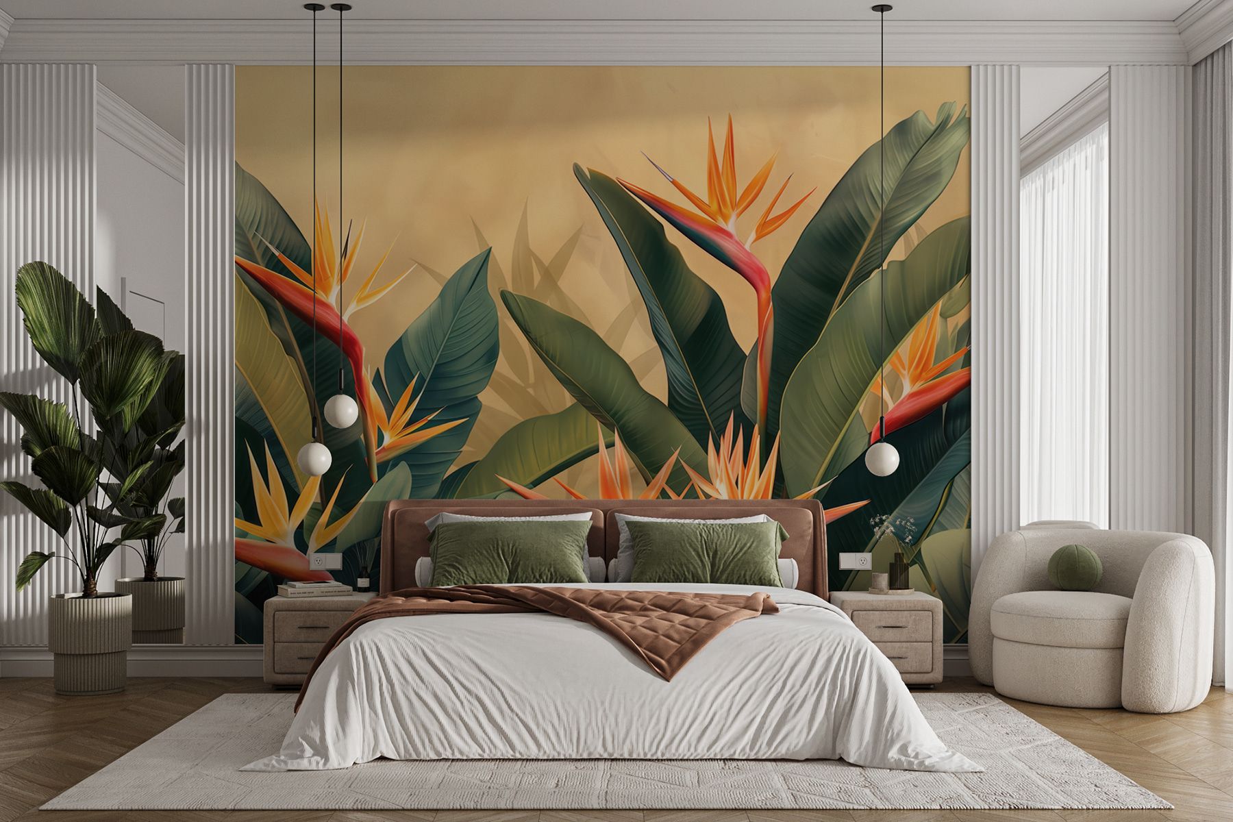 Transforme cualquier habitación en un paraíso tropical con este impresionante mural de pared con vibrantes plantas de Ave del Paraíso. Los verdes intensos y los naranjas ardientes crean un telón de fondo animado que levanta el ánimo al instante. Imagine entrar en su salón y sentirse como en una escapada tropical bañada por el sol. Es como llevar un trozo de naturaleza al interior, perfecto para esas tardes acogedoras con un libro o un cóctel en la mano. Además, es un gran tema de conversación. Los invitados te preguntarán de dónde ha salido ese fabuloso mural, y tú podrás sonreír y decir que es el secreto de tu escapada chic.