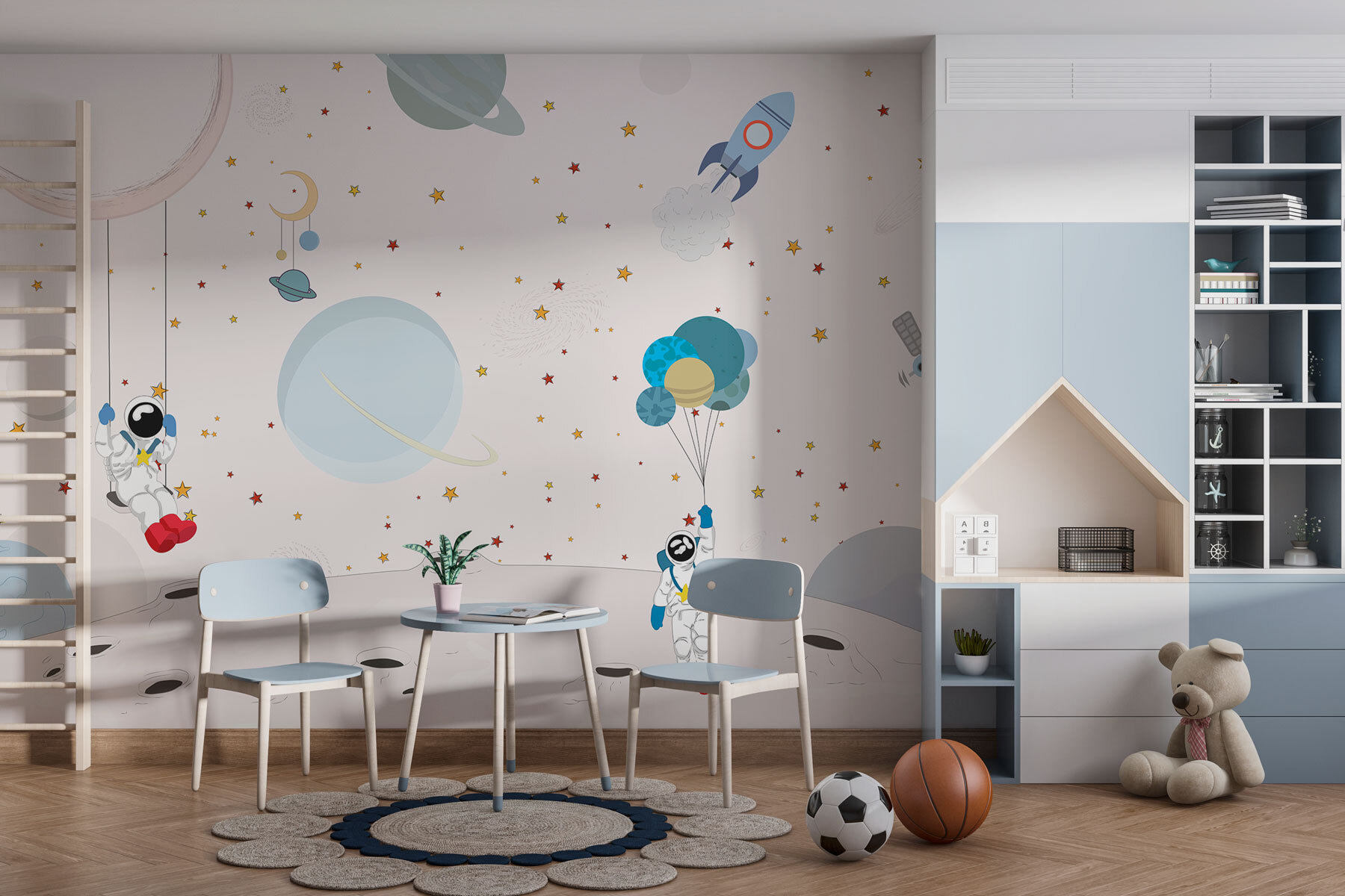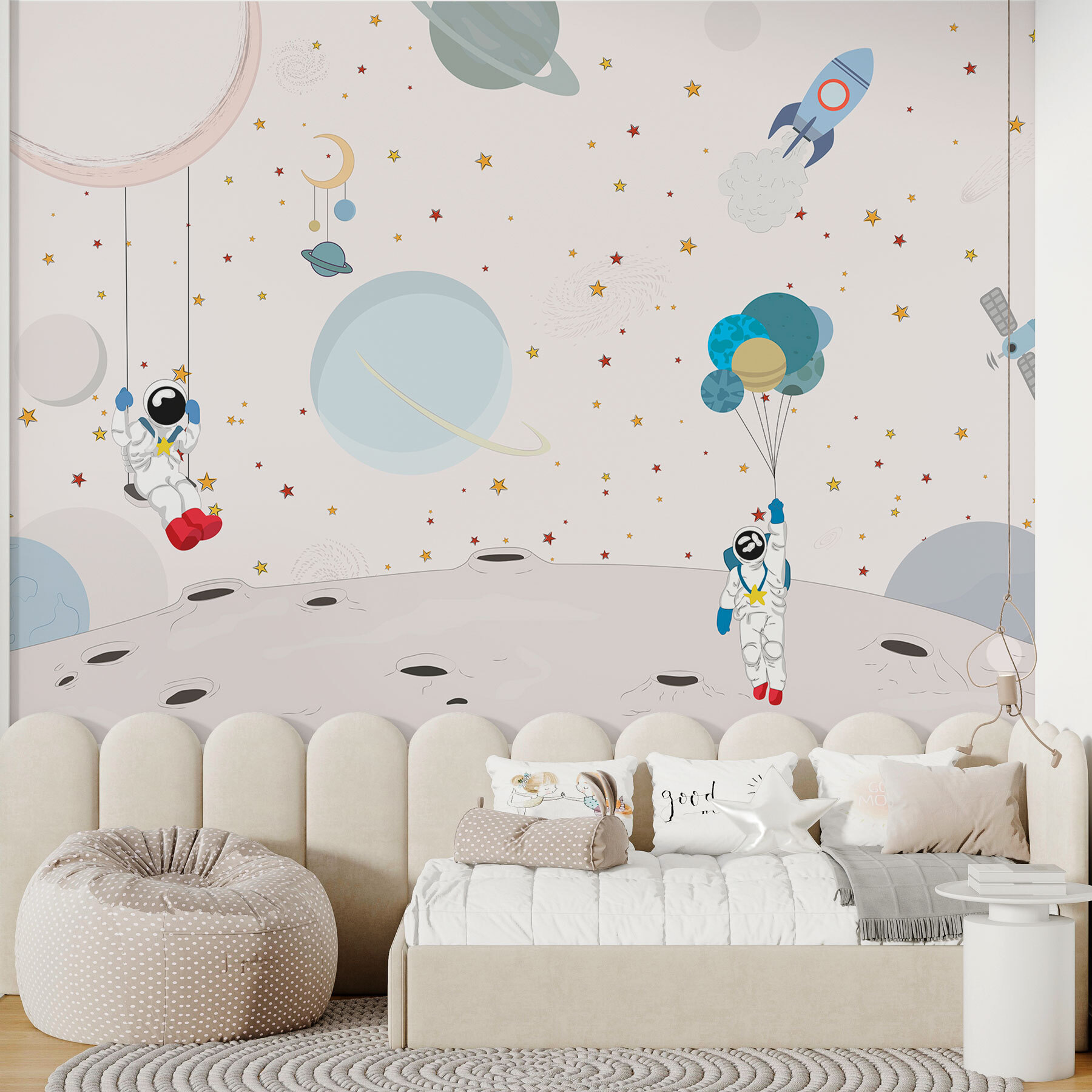 ¡Sueñe un poco con “Murales de pared w01489”! ¿Alguna vez has pensado en tener una galaxia en tu salón? Pues ésta es tu oportunidad. Este mural es una caprichosa mezcla de estrellas, planetas y nuestros adorables astronautas divirtiéndose como nunca en la Luna. Perfecto para cualquiera que siempre tenga la cabeza en las nubes… ¡o en las estrellas! Imagínese descansando bajo un cielo nocturno de ensueño mientras toma un té o lee su libro favorito. Es como invitar a un trocito del cosmos a tu espacio. Pura magia, ¿verdad? 🌌✨