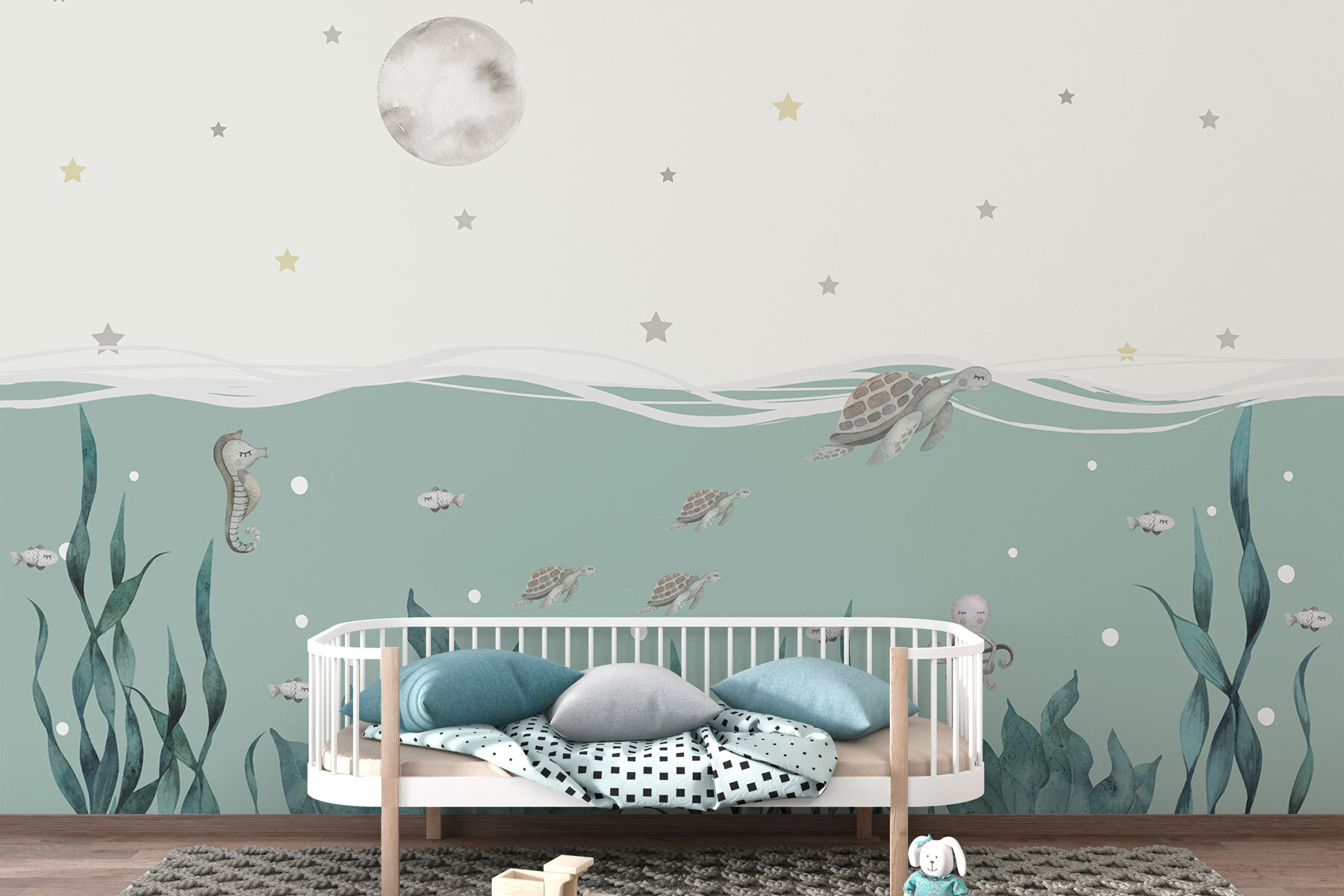Imagine sumergirse en un sereno mundo submarino cada vez que entre en la habitación. Este mural “Seaweed & Seahorses” captura la suave danza de las criaturas marinas bajo un cielo nocturno estrellado. Es como si sus paredes se sumergieran en el océano. Perfecto para cualquier espacio que necesite un toque de fantasía o un ambiente relajante. Además, ¿a quién no le apetece ver cómo se deslizan las pequeñas tortugas mientras se toma el café de la mañana? Adelante, añade un toque marino a tu decoración y deja volar tu imaginación.