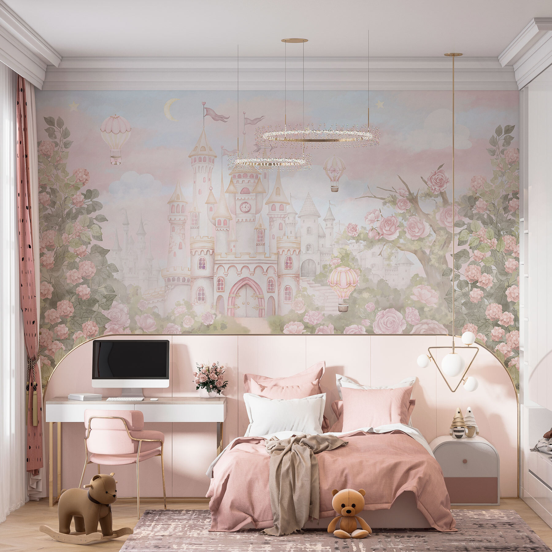 Imagínese entrar en una habitación y ser transportado a un castillo de ensueño rodeado de exuberantes rosas y caprichosos globos aerostáticos flotando. Este mural de pared no es sólo decoración, es una historia. Perfecto para los que adoran un toque de magia en su espacio, es como abrir un libro de cuentos de hadas cada vez que se entra en él. Siente la suave brisa mientras los globos flotan por el cielo en tonos pastel y deja que el suave rubor de las flores te transporte a un bosque mágico. Es el tipo de escena que hace acogedor un día lluvioso, despertando la imaginación y dulces ensoñaciones.