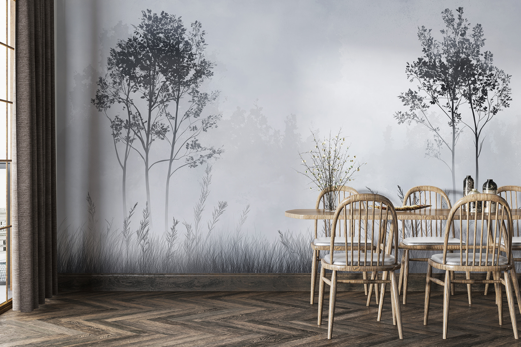 Transforme cualquier habitación en una escapada serena con este mural de paisaje con niebla. Imagina una suave niebla sobre la hierba y los delicados árboles, creando una atmósfera de ensueño perfecta para soñar despierto o relajarse después de un largo día. Los tonos apagados invitan a la calma, por lo que es ideal para espacios acogedores como un rincón de lectura o un dormitorio tranquilo. Imagínatelo: tomando el té, rodeado de naturaleza, con una suave brisa en tu mente. Es como llevar el aire libre al interior, ¡sin los zapatos llenos de barro! Un telón de fondo perfecto para esos momentos en los que el mundo parece demasiado ajetreado, este mural susurra tranquilidad.