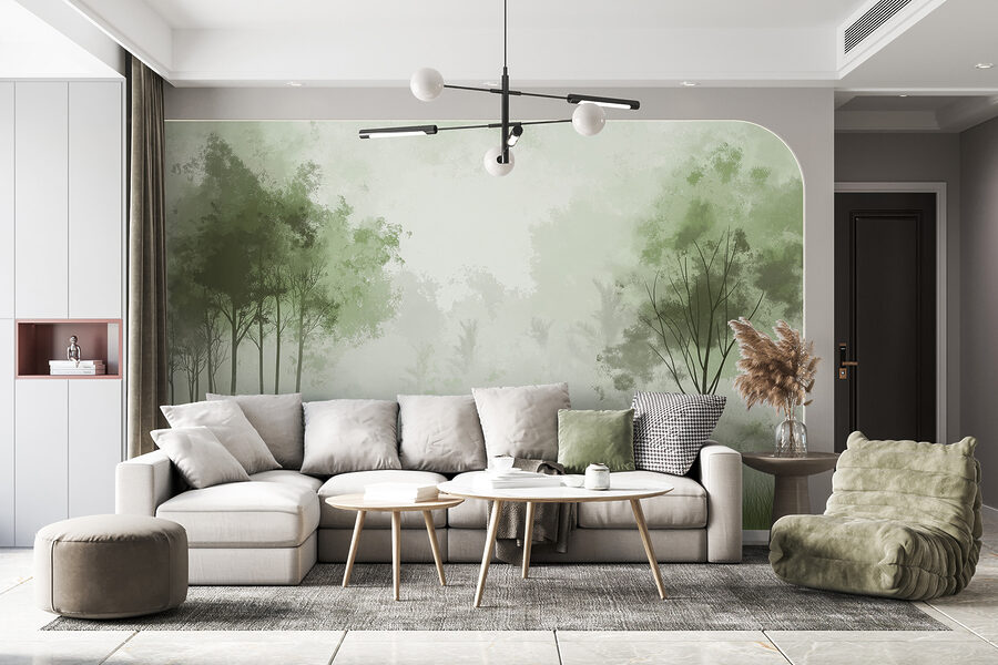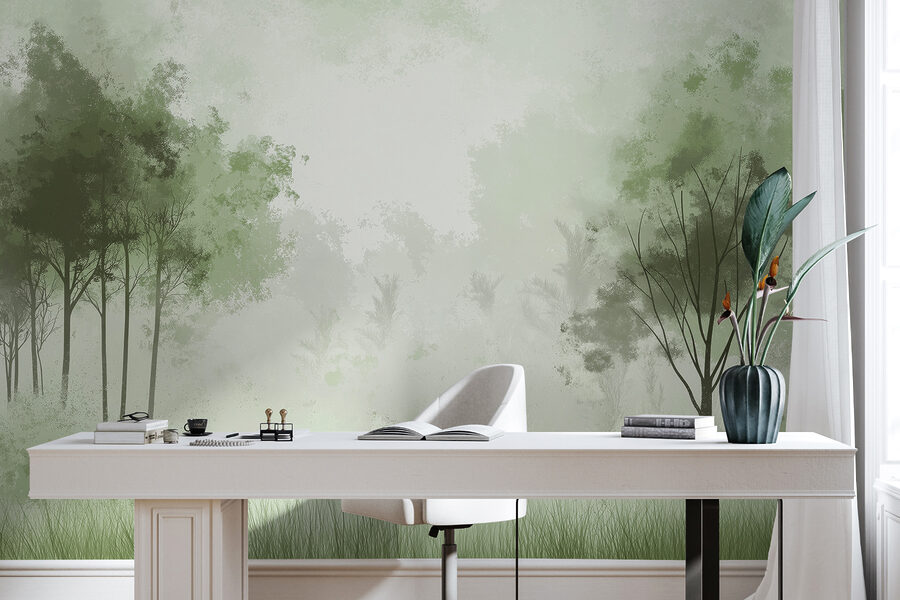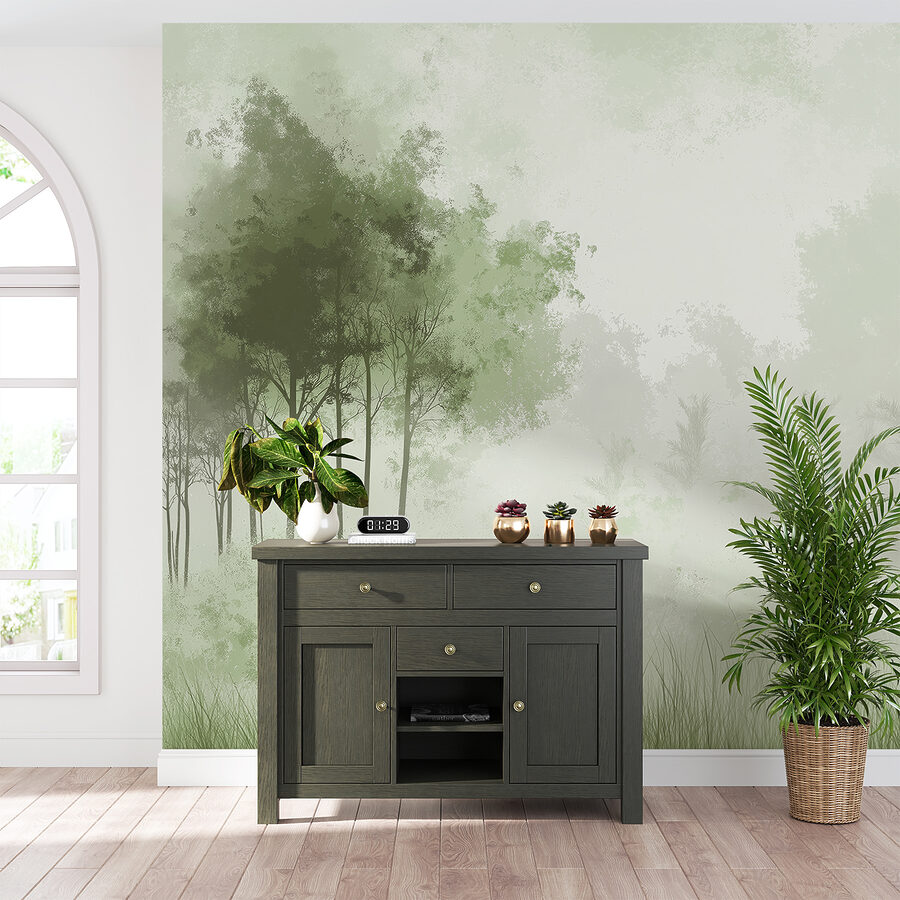 Imagínese entrar en una habitación y sentir al instante que se ha adentrado en un brumoso bosque matutino. Este mural “Bosque brumoso con árboles” hace exactamente eso: es como un suave abrazo de la naturaleza, justo en su pared. Perfecto para cualquiera que ame la tranquilidad de los bosques pero prefiera evitar los mosquitos. Los verdes suaves y apagados y la niebla misteriosa crean un ambiente tranquilizador, ideal para relajarse después de un día ajetreado. Es el tipo de cosa que puede hacer que tu gato mire fijamente a la pared, convencido de que hay una ardilla escondida en alguna parte. Un encanto inesperado, garantizado.