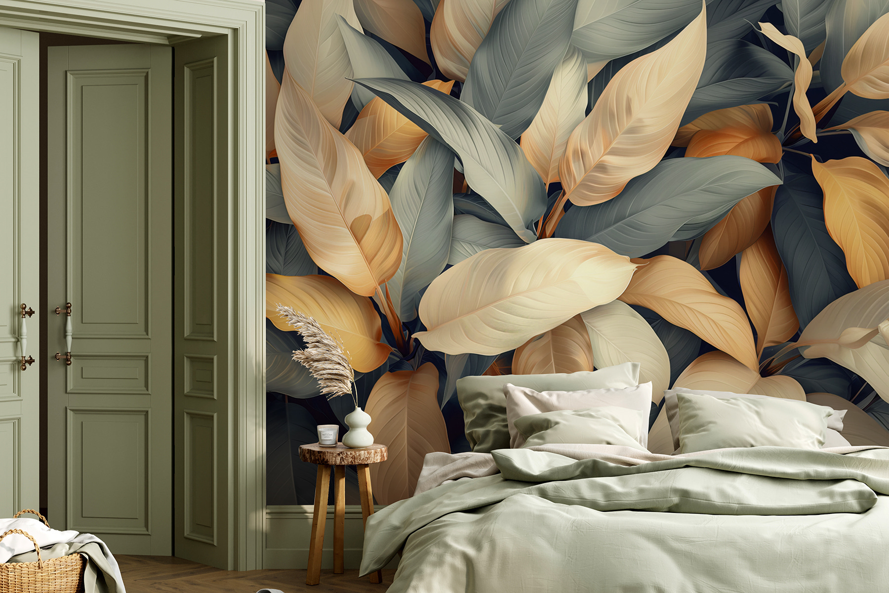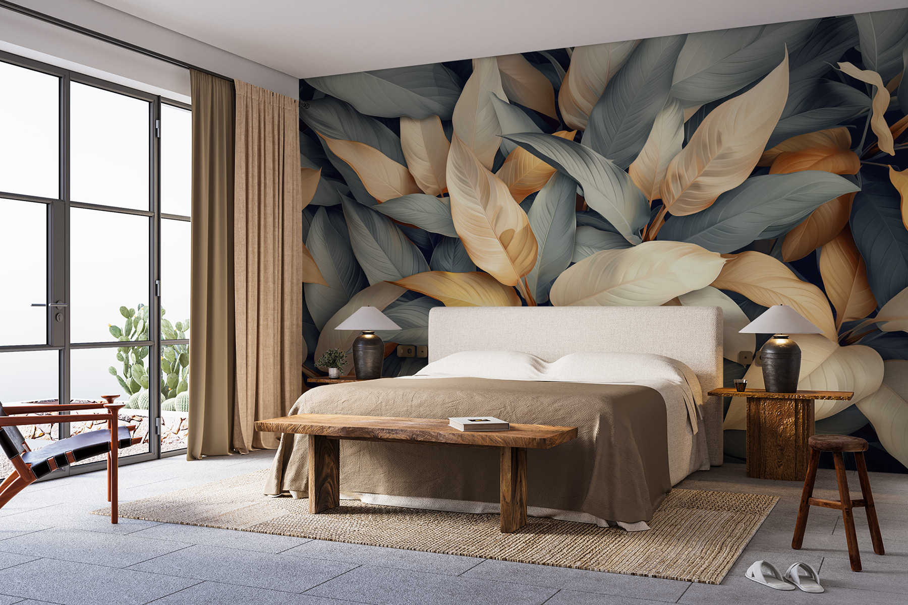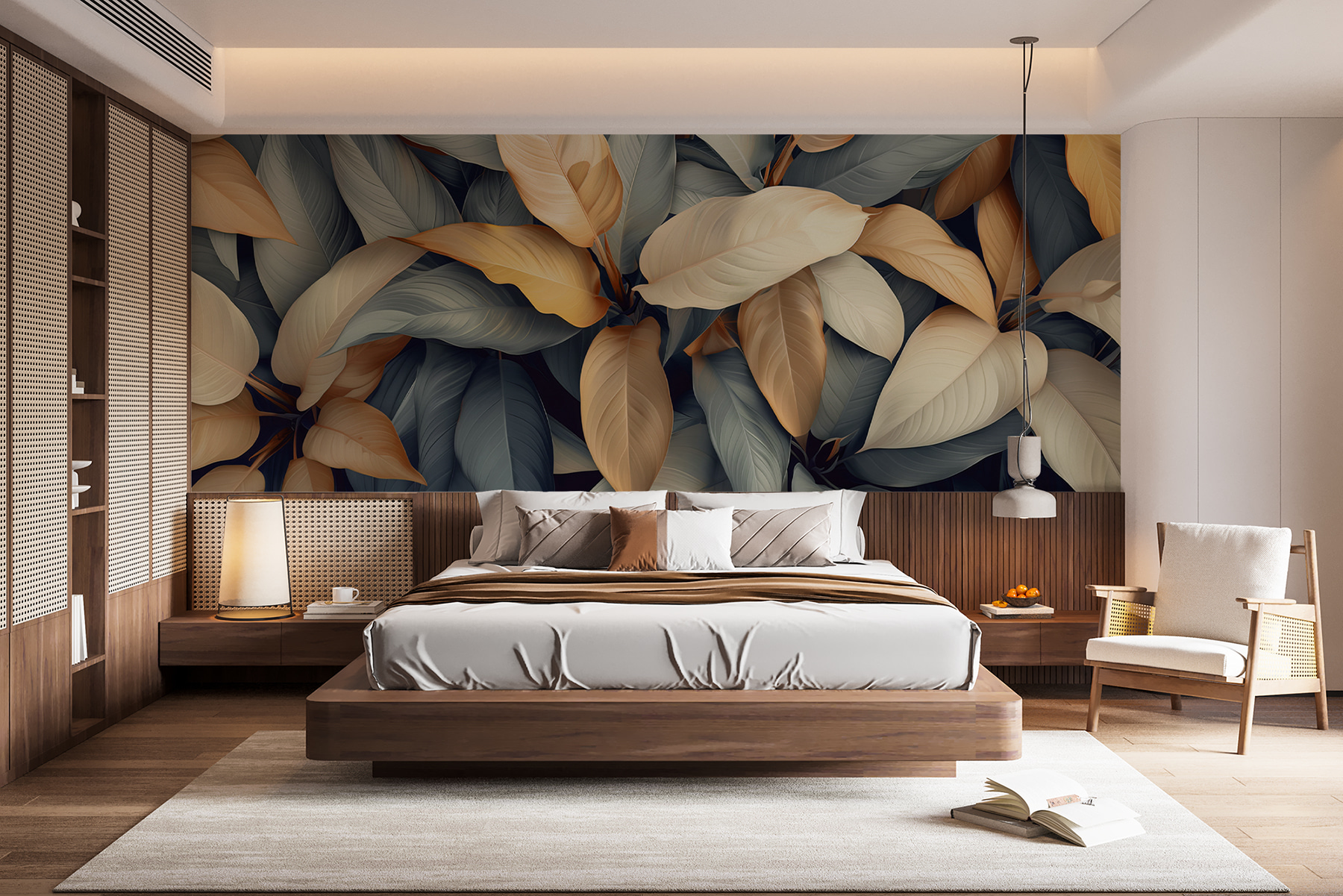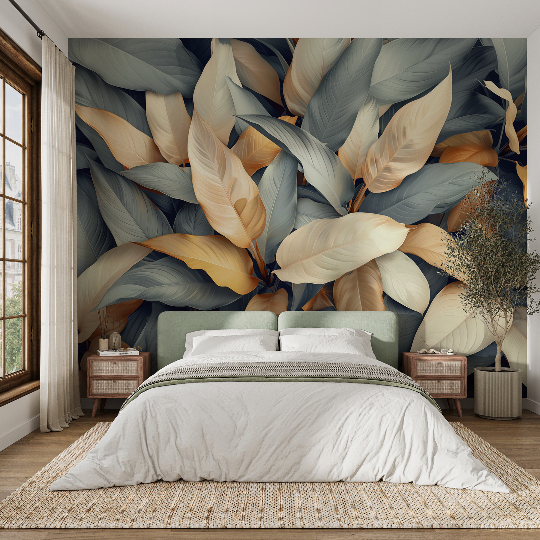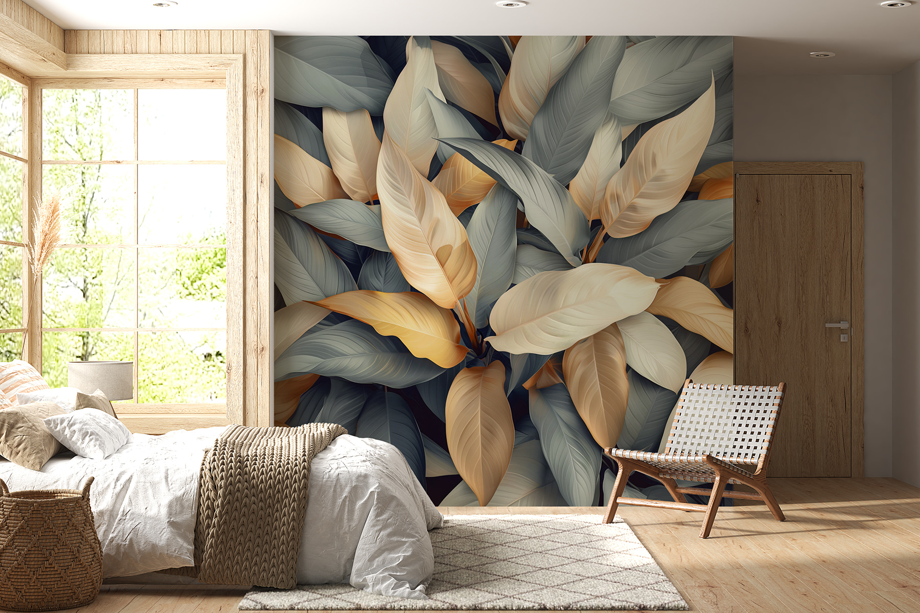 Transforme su espacio con este impresionante mural de hojas de colores. Imagine entrar en una habitación donde la naturaleza cobra vida, envolviéndole en calidez y tranquilidad. Con cada mirada, esos suaves matices de crema y dorado bailando contra tonos fríos crean una atmósfera relajante pero vibrante. Es como traer el exterior al interior sin tener que regar ni una sola planta. Ideal para un acogedor rincón de lectura o una animada oficina, este mural puede hacer que cada día parezca un refrescante paseo por un exuberante jardín. La mezcla de colores levanta sutilmente el ánimo y despierta la inspiración, por lo que es perfecto para cualquiera que desee crear un refugio acogedor. No se sorprenda si se encuentra soñando despierto entre las hojas: ¡es uno de esos murales que le atraen!