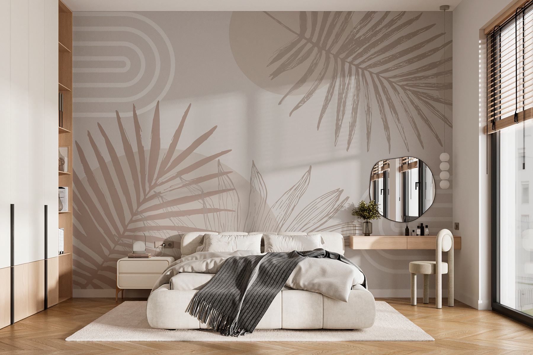 Echa un vistazo a este fabuloso mural: tonos neutros con divertidas formas geométricas y hojas de palmera. Imagínatelo: una perezosa mañana de domingo, con un café en la mano, disfrutando de la tranquilidad que transmite este mural. Es como unas minivacaciones en la pared. Perfecto para los que desean un poco de trópico sin jet lag. Tanto si estás renovando tu salón como acicalando un despacho en casa, este diseño añade una pizca de estilo a la vez que susurra: “Relájate, estás en casa”. ¡A tus paredes les va a encantar!