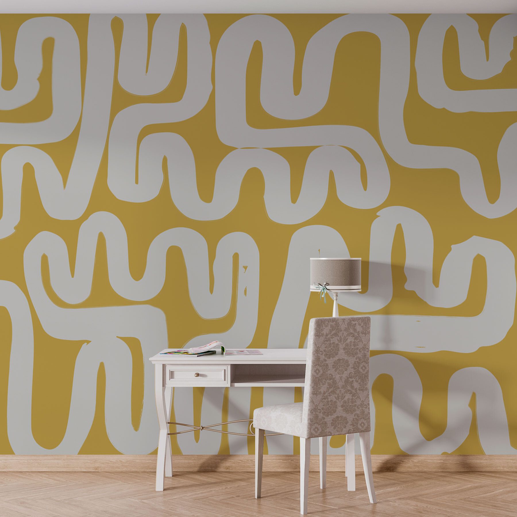 Alegra cualquier espacio con el mural Laberinto blanco y amarillo. Este juguetón diseño mezcla amarillo brillante con líneas blancas fluidas, creando una sensación de movimiento que parece un alegre laberinto. Imagina que entras en una habitación donde la vida parece un poco más divertida. Es perfecto para un rincón de lectura acogedor, una oficina en casa o incluso una sala de estar animada, porque ¿quién no quiere que sus invitados se sientan como si estuvieran paseando por un pequeño y alegre rompecabezas?