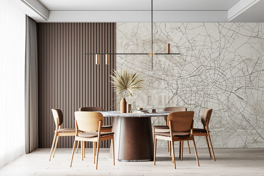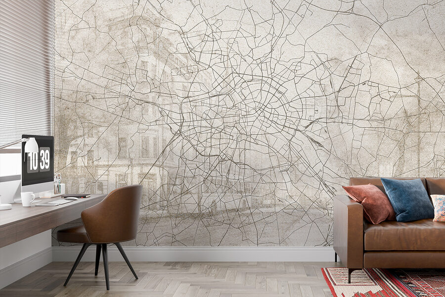 Imagine entrar en una habitación y ser recibido por un intrincado mural cartográfico que revela los secretos de una ciudad. Es como tener una vista de pájaro sin levantarse del sofá. Este mural cuenta historias de carreteras sinuosas y caminos ocultos, como si fueras un explorador moderno, pero sin ampollas. Los tonos terrosos combinan a la perfección, y hay un toque de nostalgia mezclado con aventura. Perfecto para soñadores y trotamundos que disfrutan soñando despiertos. Seguro que dará que hablar: ¡a todo el mundo le gusta “perderse” en un buen mapa!