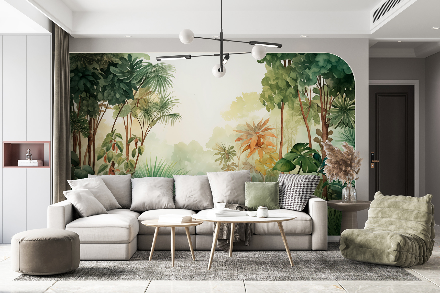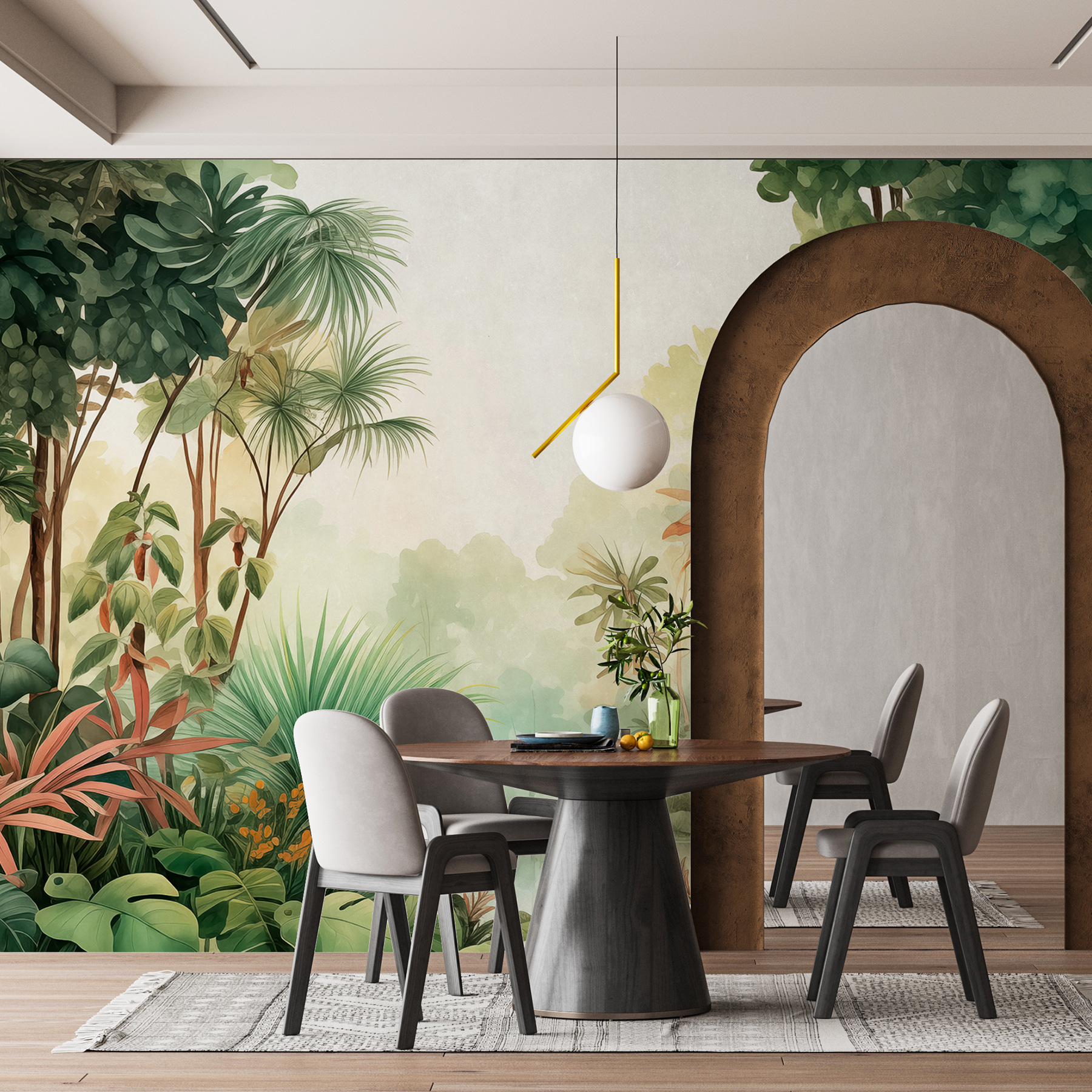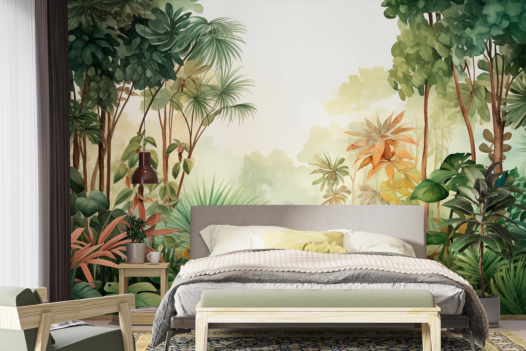 Imagina entrar en una habitación y ser transportado instantáneamente a una serena selva de acuarela. Este mural, amigos, lleva ese exuberante ambiente selvático directamente a sus paredes. No es sólo un cuadro, es una escapada. Los tonos verdes parecen susurrar calma, perfectos para relajarse después de un día ajetreado. Imagínate un día lluvioso acurrucado con tu libro favorito, o incluso celebrando una reunión con amigos que no pueden dejar de admirar tu oasis en el bosque. Es como si las paredes te dieran un suave y frondoso abrazo.