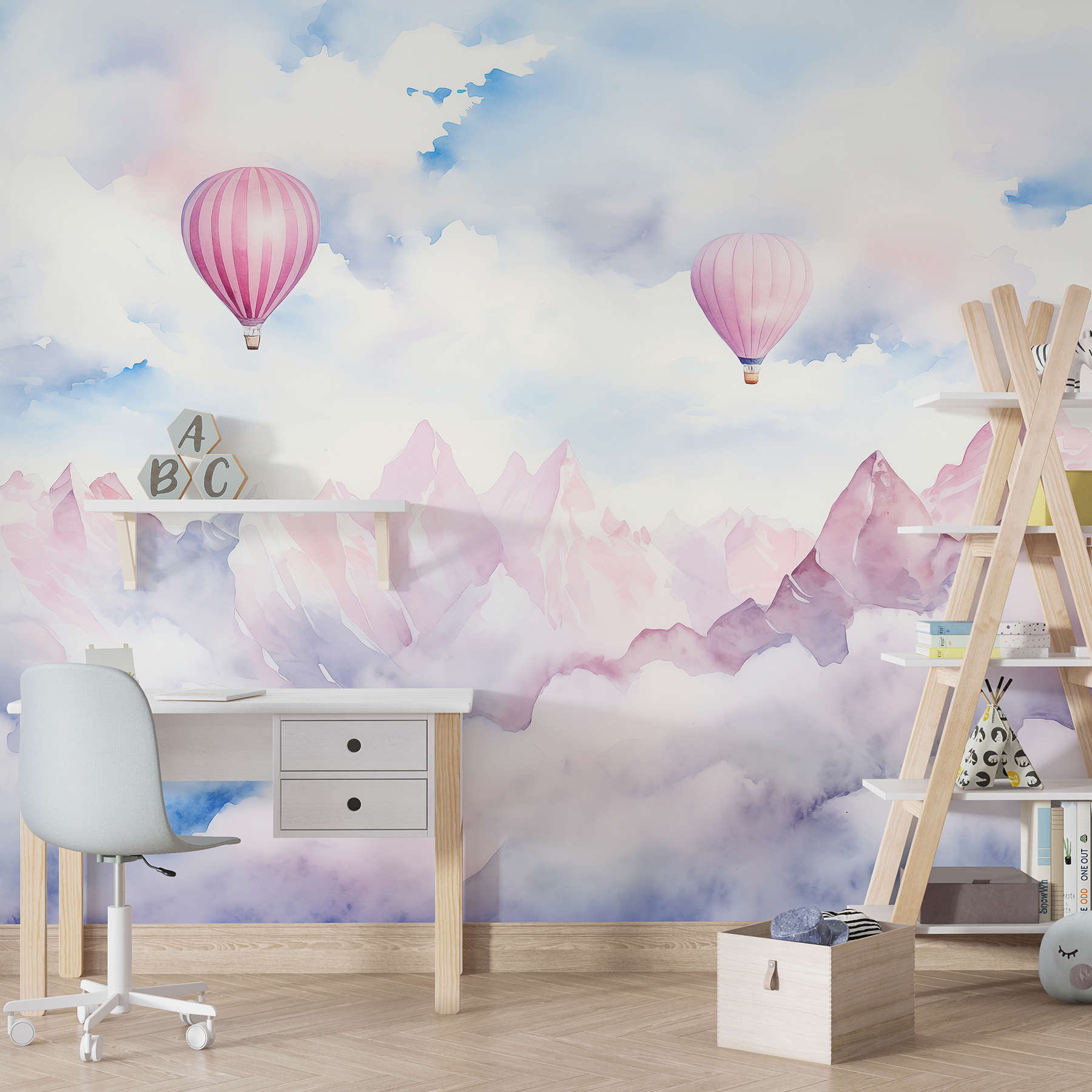 Imagina que te despiertas y te tomas el café de la mañana mientras un par de globos aerostáticos flotan soñadoramente por la pared. Los ricos tonos de acuarela capturan la luz y el aire de un día perfecto por encima de las nubes. Este mural no es sólo decoración, es como tener una ventana a un mundo encantador y sereno. Tiene ese aire mágico y viajero sin salir de casa. Perfecto para soñadores y aventureros por igual. Un toque de majestuosidad montañosa y cielos apacibles… es como un abrazo de la naturaleza para tus paredes.
